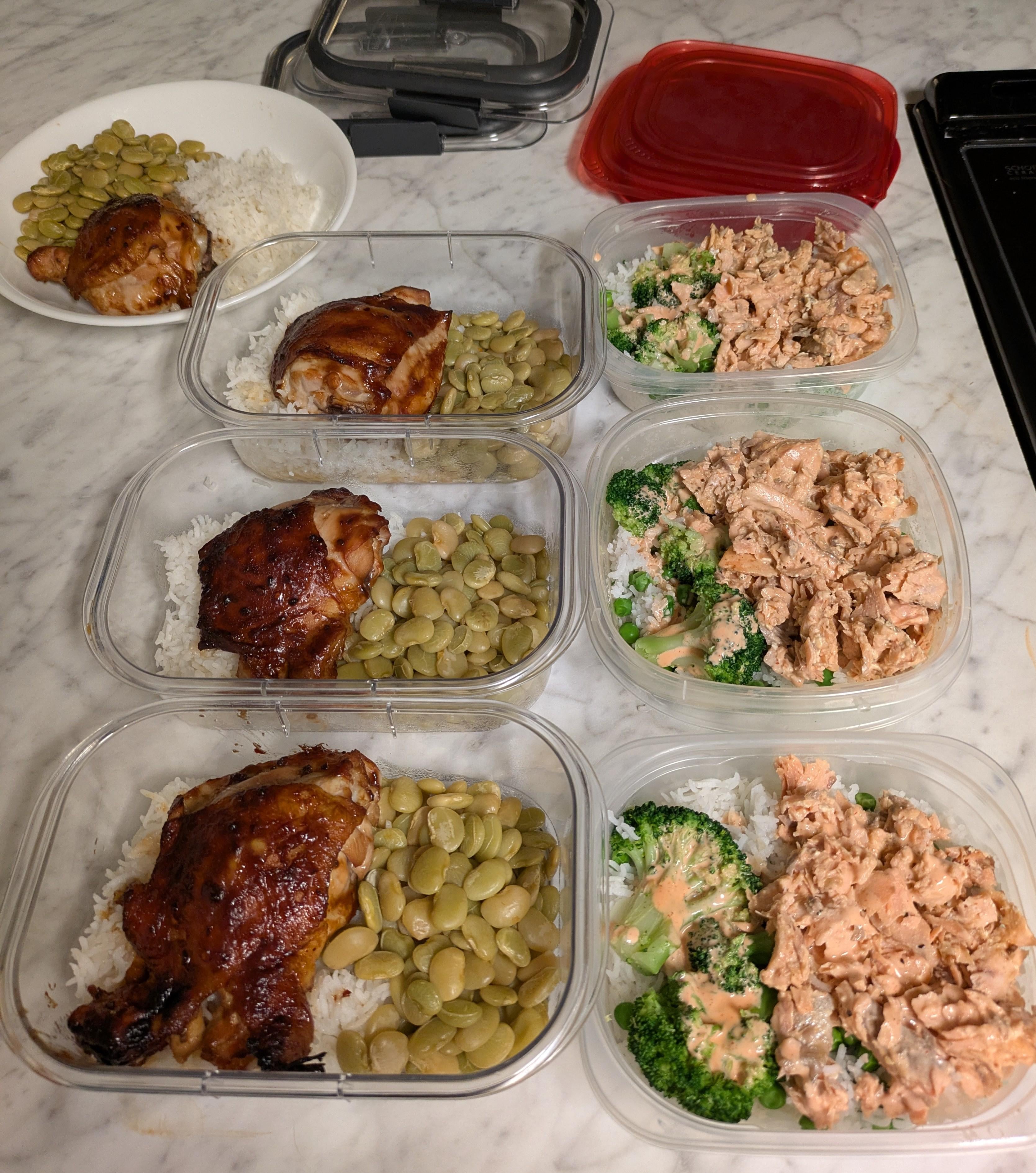 Chicken thighs tossed with sesame garlic sauce (Iron Kitchen brand) and then baked in the oven. Lima beans boiled in vegetable broth. Plain basmati rice on the bottom.