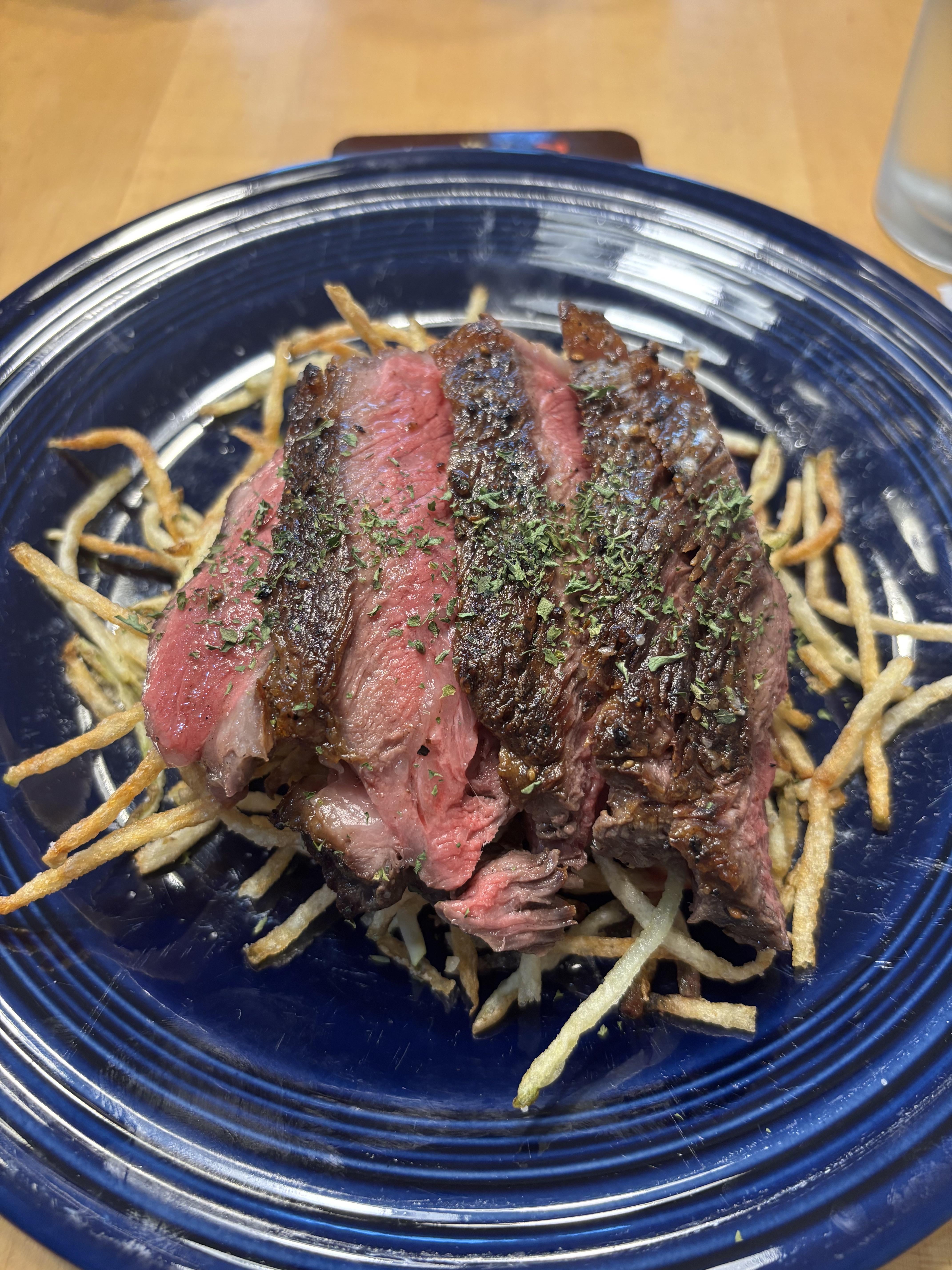 Those fries look amazing. Steak looks beautiful. My only gripe is the dried herbs, I’d prefer fresh as a garnish but hey I ain’t eating it.