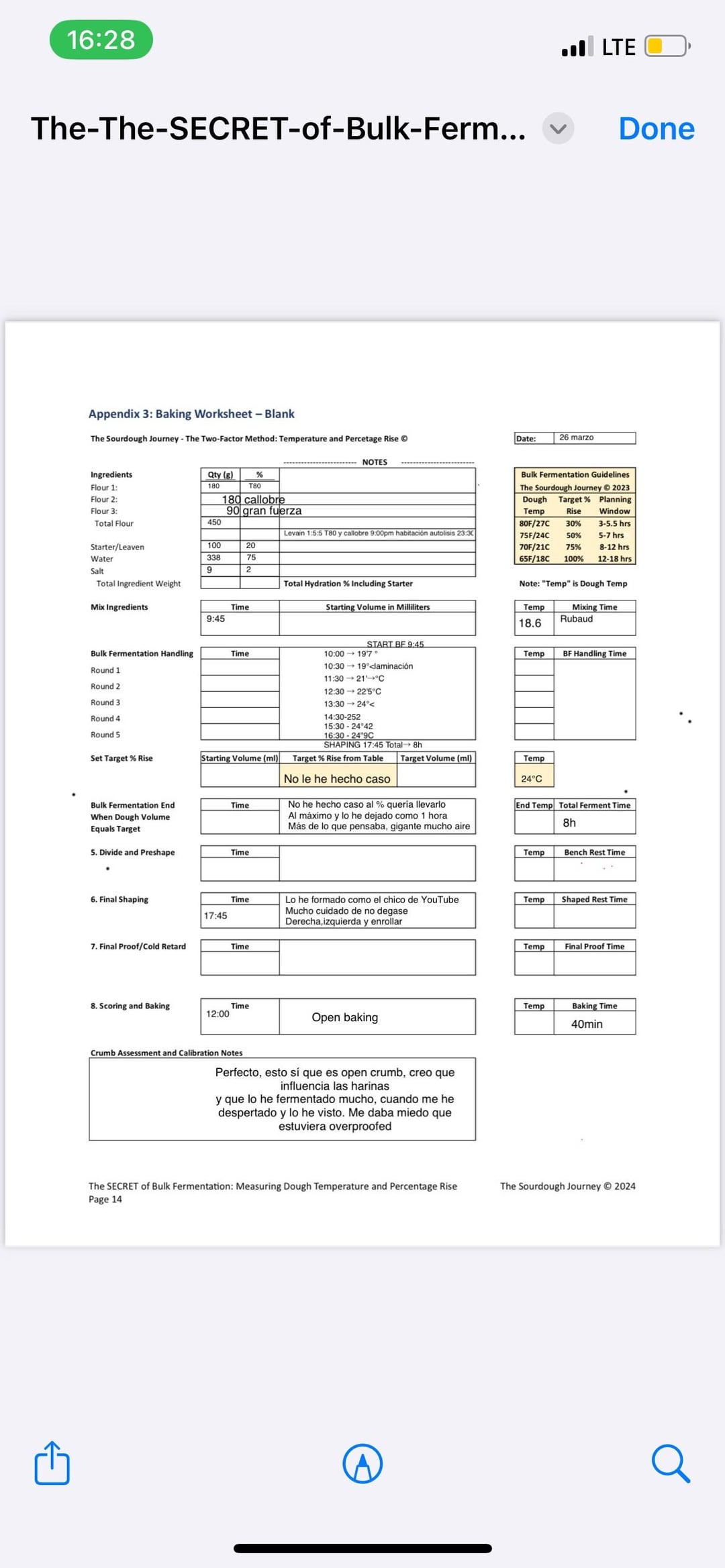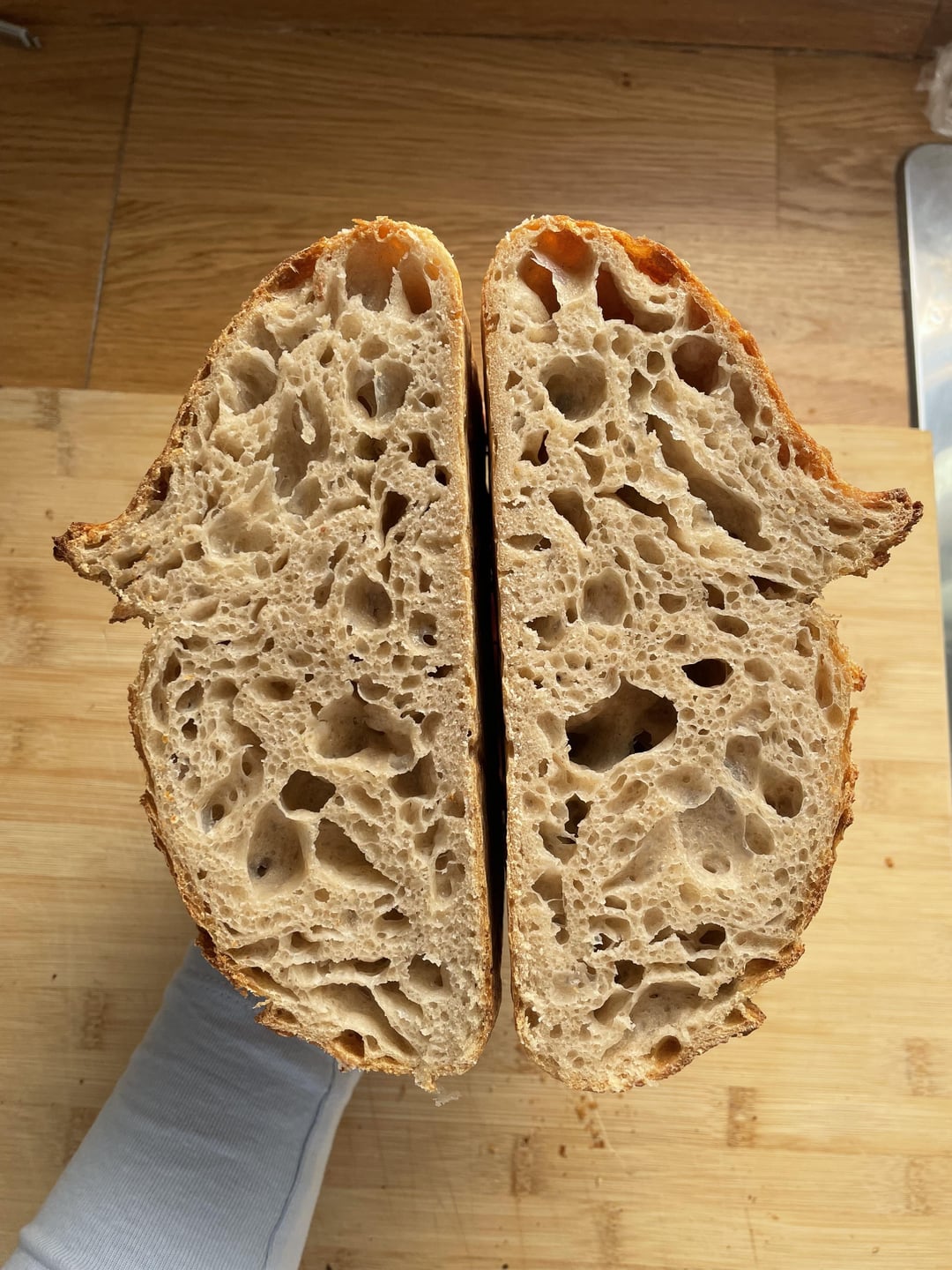For me the perfect crumb and the best loaf I’ve made so far. The biggest difference I’ve made in the recipe is to extend bulk fermentation to the maximum, it was 8hours around 24°C. Furthermore, I didn’t preshaped and I tried to do the shaping as carefully as possible. In the morning I thought my dough had overproofed (and maybe it was true) and I was afraid I was going to get a flat pancake, however I got my best results. In the last picture you can see the recipe and the procedure, it’s in Spanish any doubts let me know. Also this made me think flours affect the outcome, I’m not sure you can get this type of crumb with any flours, however I need more research in order to confirm that and know what flour is best.