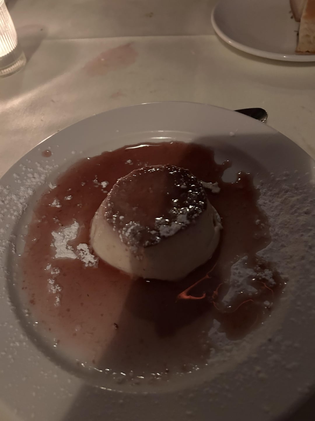 Panna Cotta. I've never had panna cotta so deliciously perfect! It was set really well, super creamy and melty. The red wine caramel was really interesting and delicious.