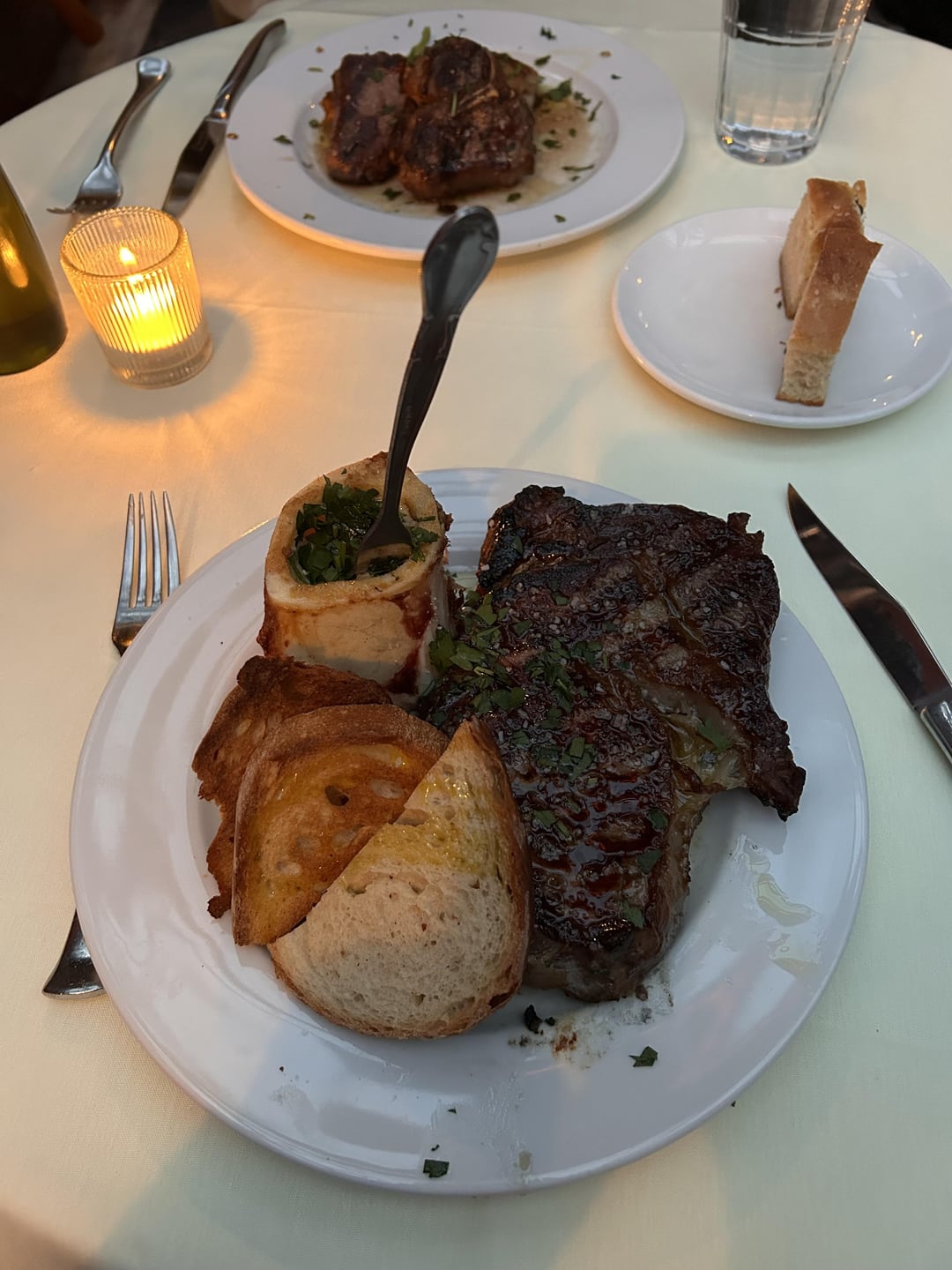 Steak with bone marrow. We ordered the steak medium rare, but it came cooked medium which was disappointing. The flavor on it was still good. I'm not a huge bone marrow fan because of the texture, but the flavor is good and it paired well with the crostini.