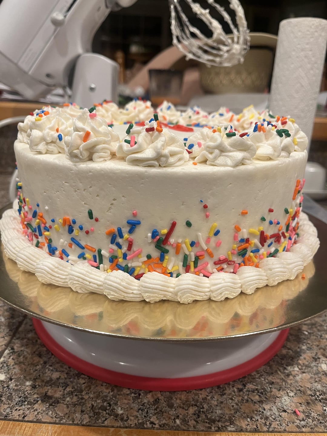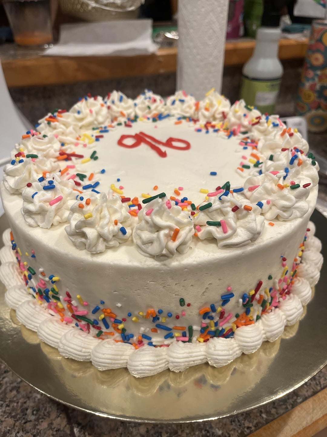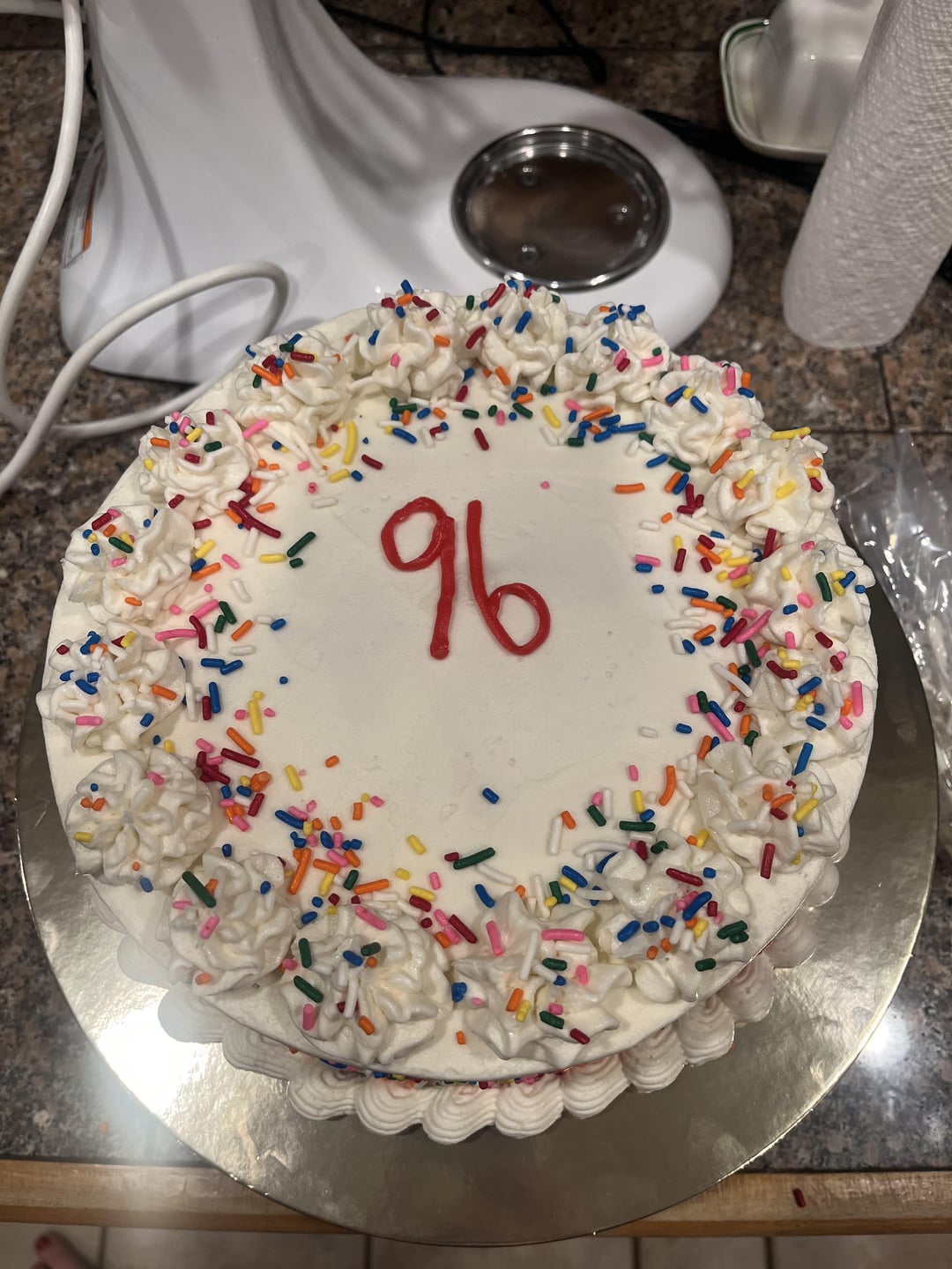 All she wanted was a white cake, so we got a vanilla cake with vanilla buttercream! I really think I could’ve made this better but I did my best and even writing “96” was hard for me as I’m very new to writing on cakes lol. I made this with so much love and really really hope she loves it! (I know the 96 isn’t EXACTLY the middle but man I did my best lol)
