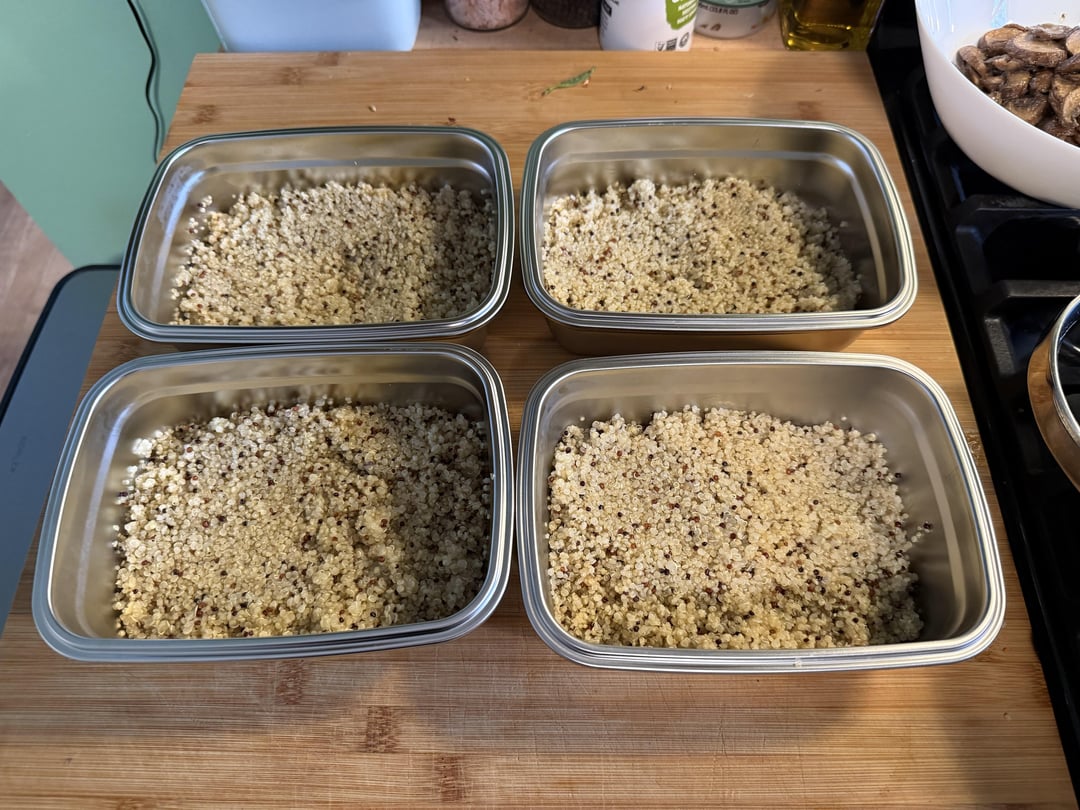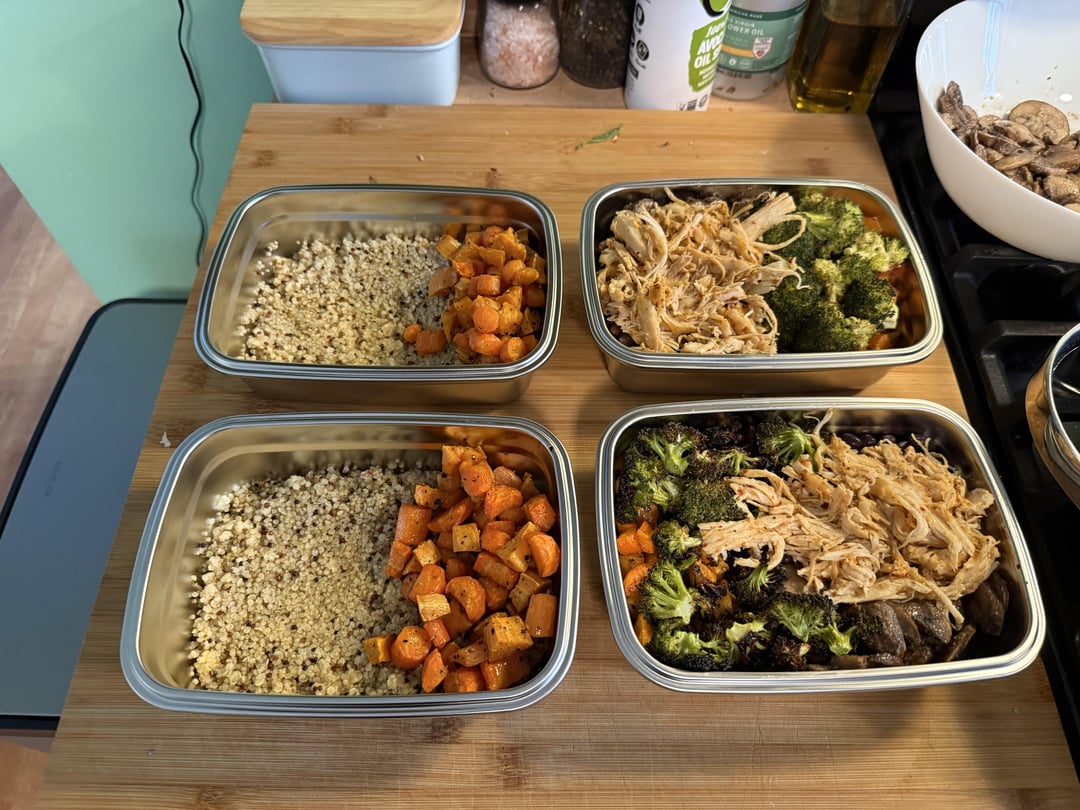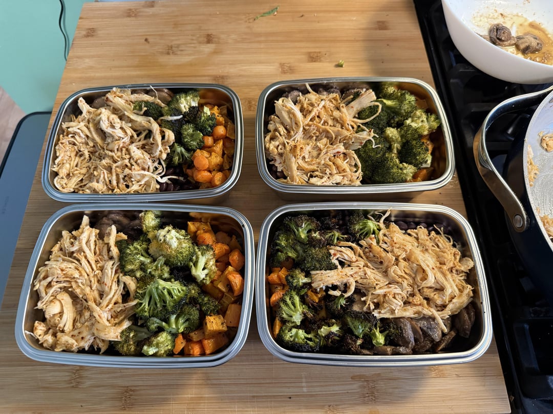 For lunch I prepared a bed of quinoa, roasted carrots, sweet potato, and broccoli. I also added some sautéed mushrooms as well as black beans from the can and shredded chicken coated in Georgian Ajika seasoning.