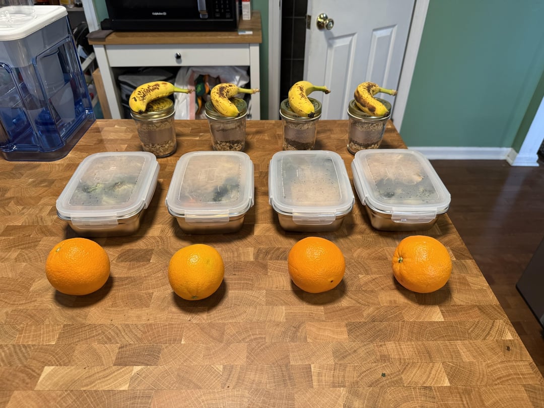 For breakfast I prepared some overnight oats with protein powder, peanut butter powder, and chia seeds. I’ll have that with almond milk and a banana.