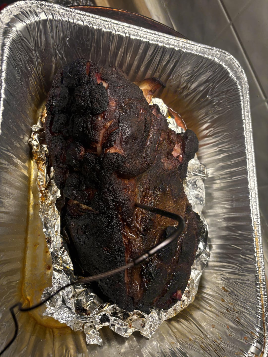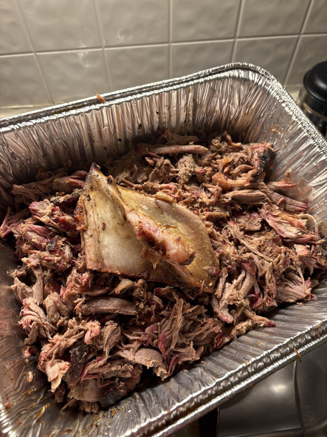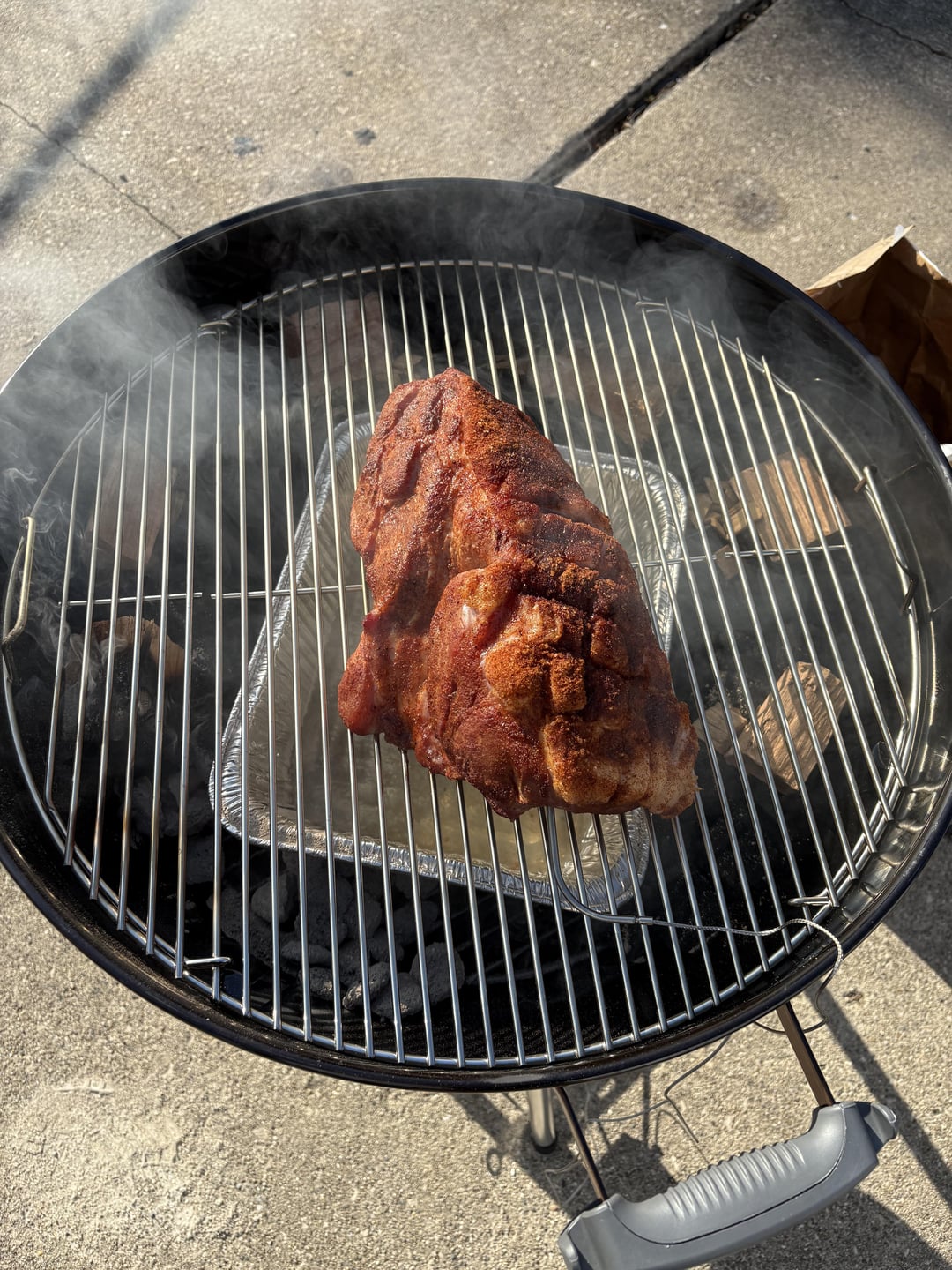 Got a Weber kettle for my birthday. Never smoked anything so pork butt seemed fitting as it's very forgiving. 5lb butt 6-7 hours. It got to 160 then stalled. Wrapped it got to 190, opened the vents to get the kettle to 300 to try and get some more bark while it reaches 200. Pulled again wrapped and set in oven to rest for about a hour(couldn't wait lol). Gotta say for my first time I was happy. Family agreed lol.