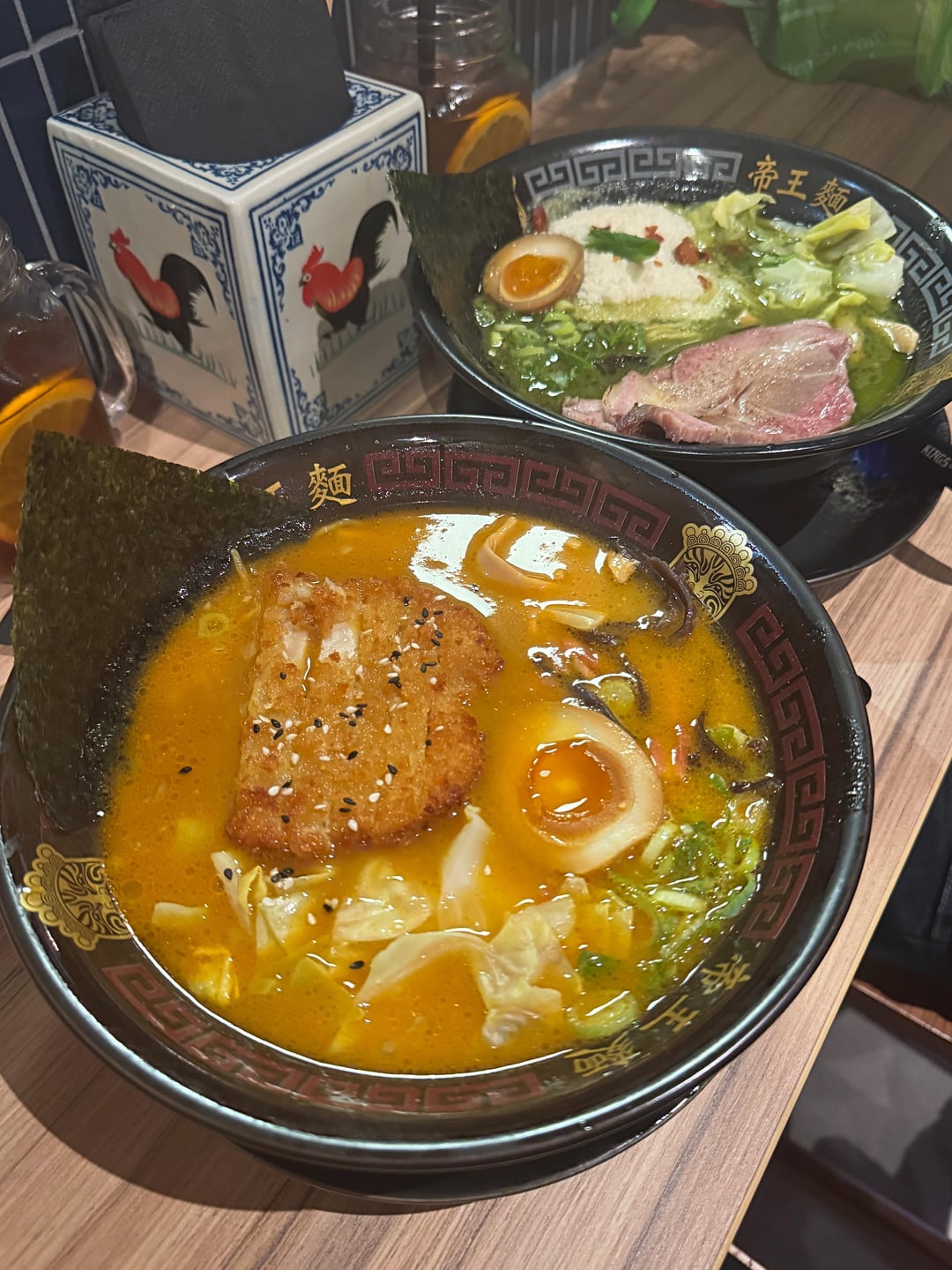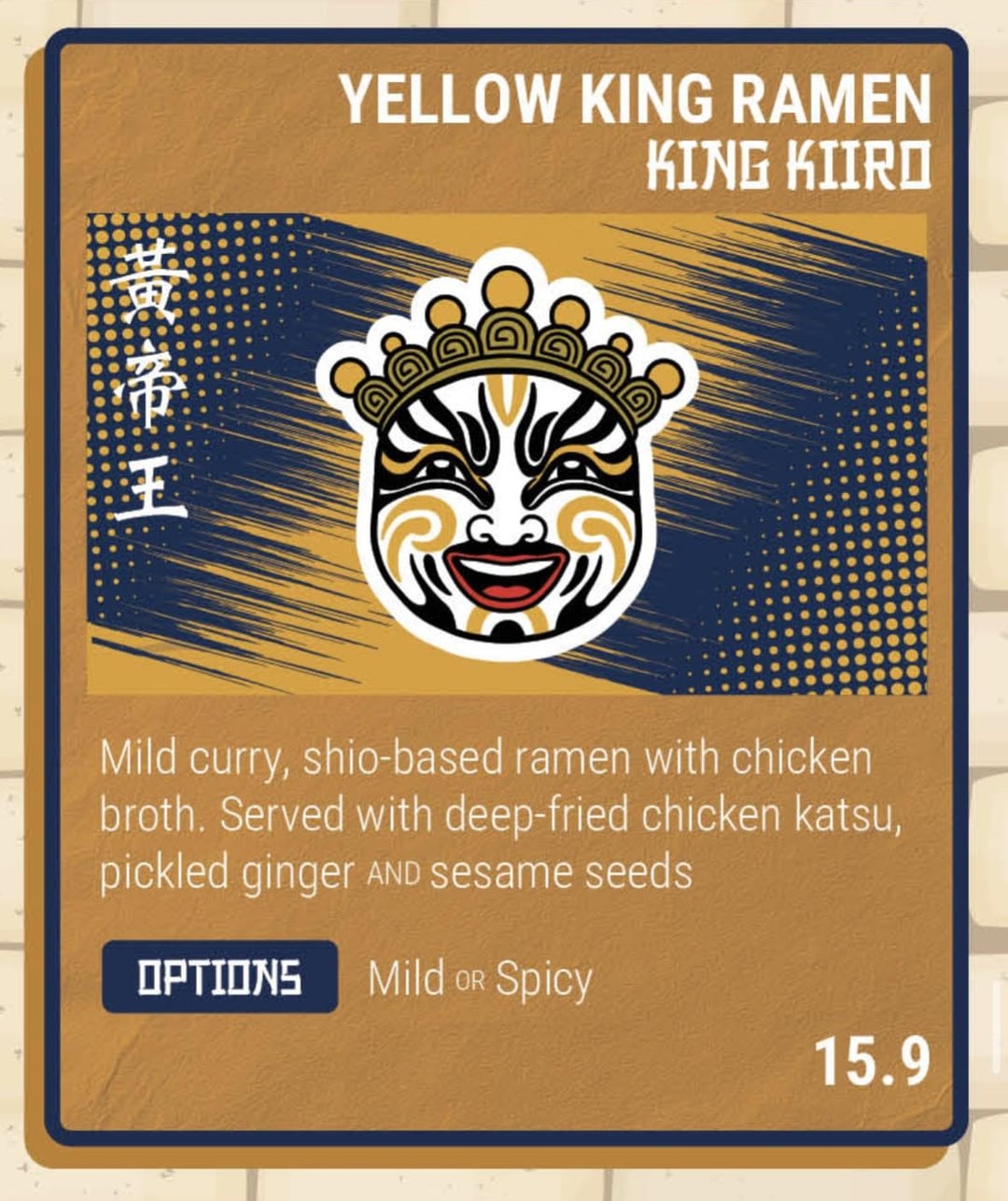 “Mild curry, shio-based ramen with chicken broth. Served with deep-fried chicken katsu, pickled ginger and sesame seeds.”