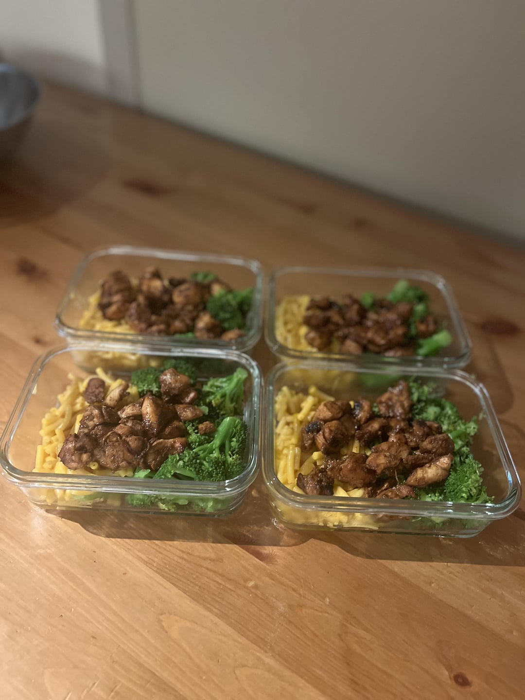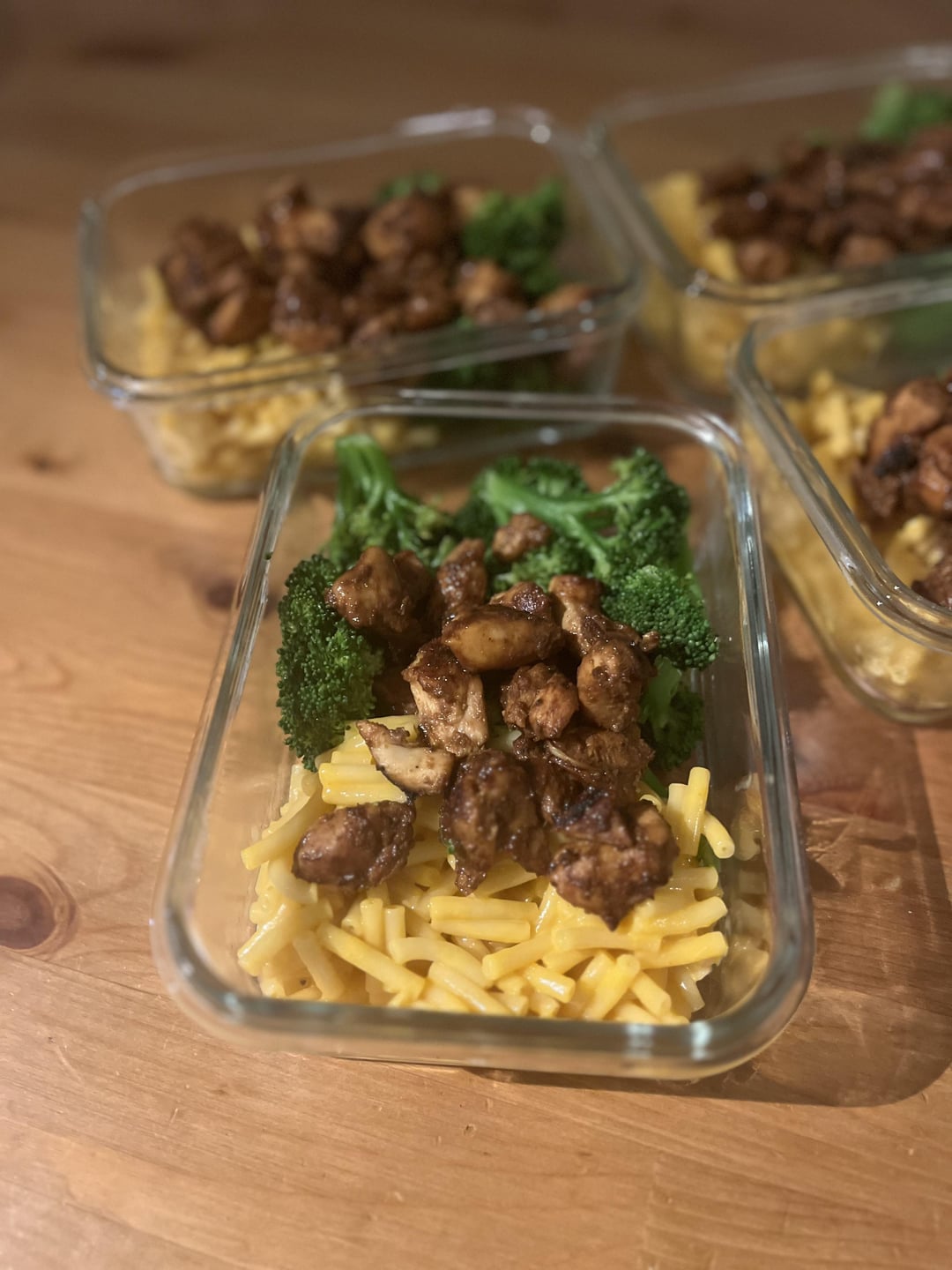 First marinate chopped chicken thighs overnight in BBQ sauce. Then cook on one side in a pan until blackened before flipping. At the same time, boil pasta water (I like using a colander atop the pot to steam my broccoli at the same time). Cook boxed mac and cheese according to instructions. Season the broccoli and portion into four servings.