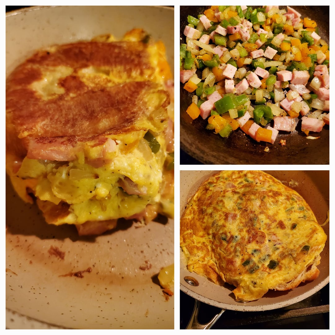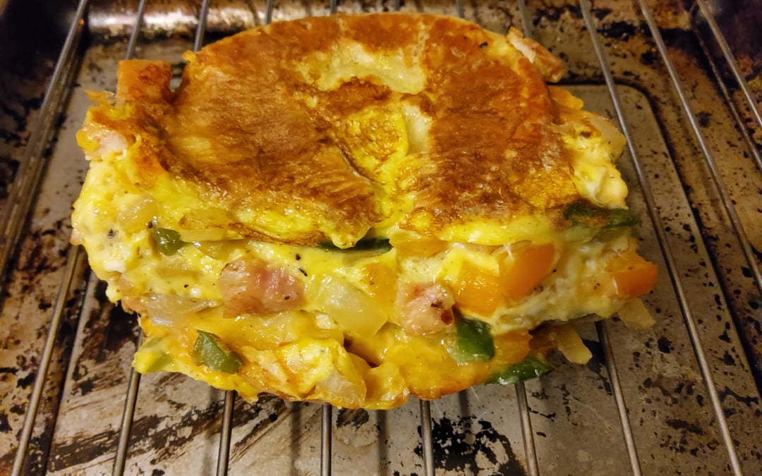 Saute diced up Canadian bacon, onions, bell pepper add eggs, dip split croissant in egg mixture for a second and then cut side down. When omelette is settled, flip it, add cheese, tuck in omelette then fold sandwich together. Finish cooking both sides.