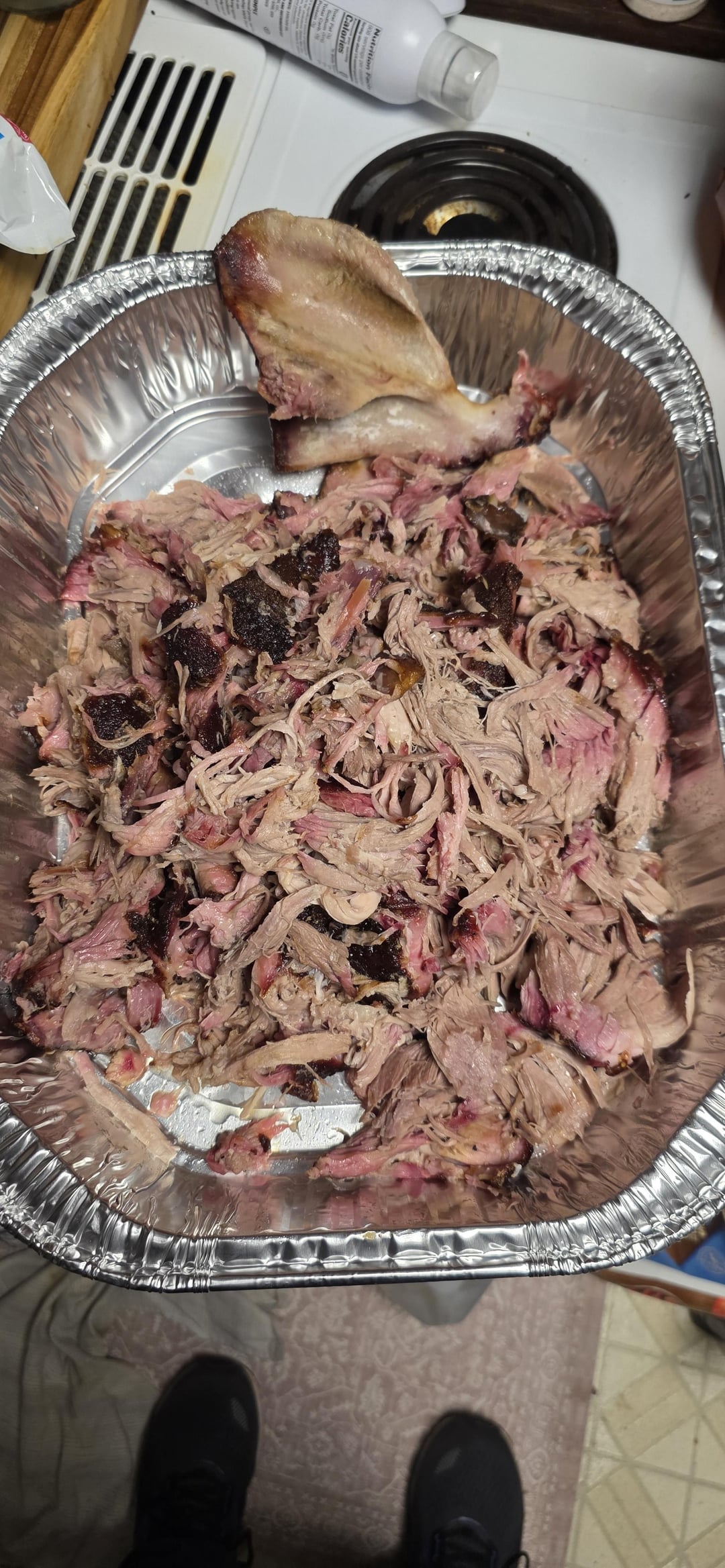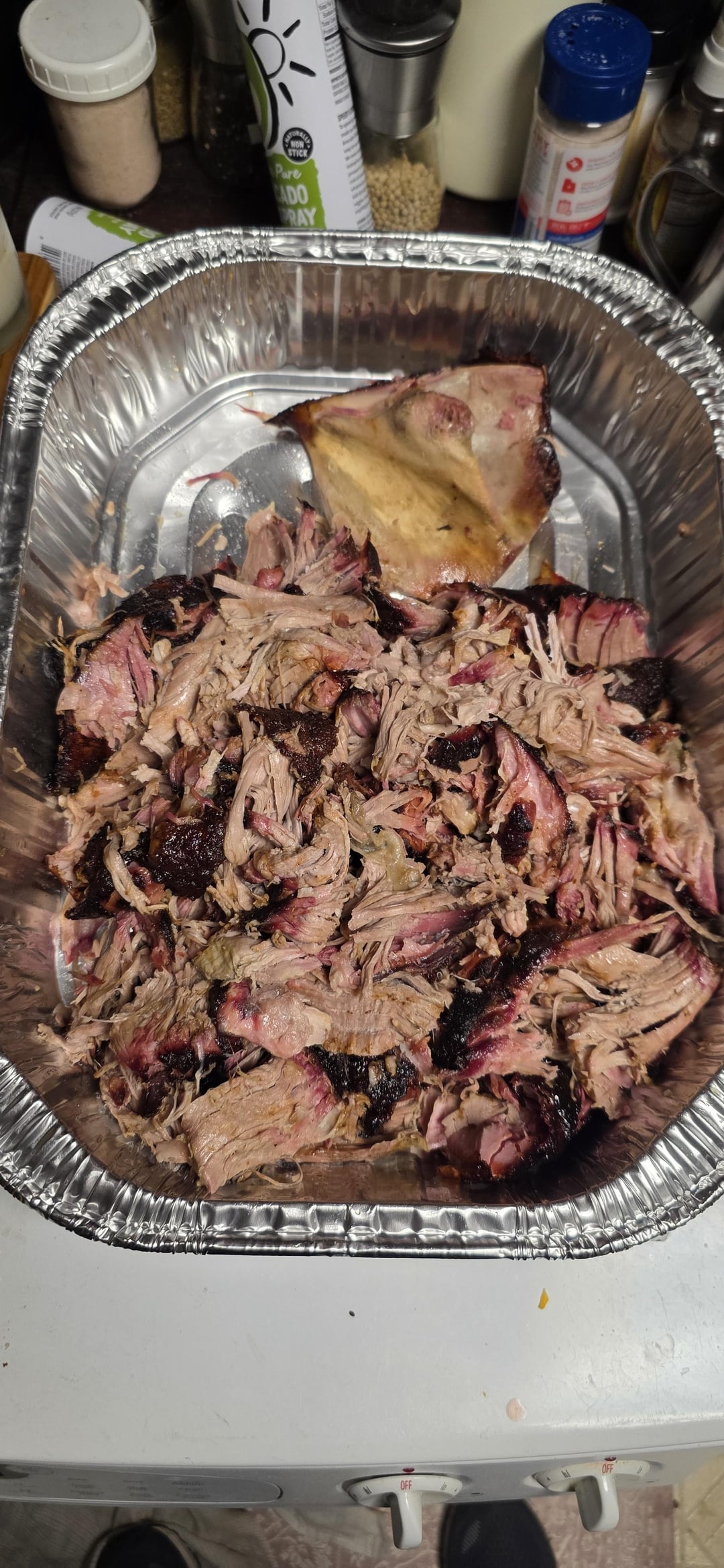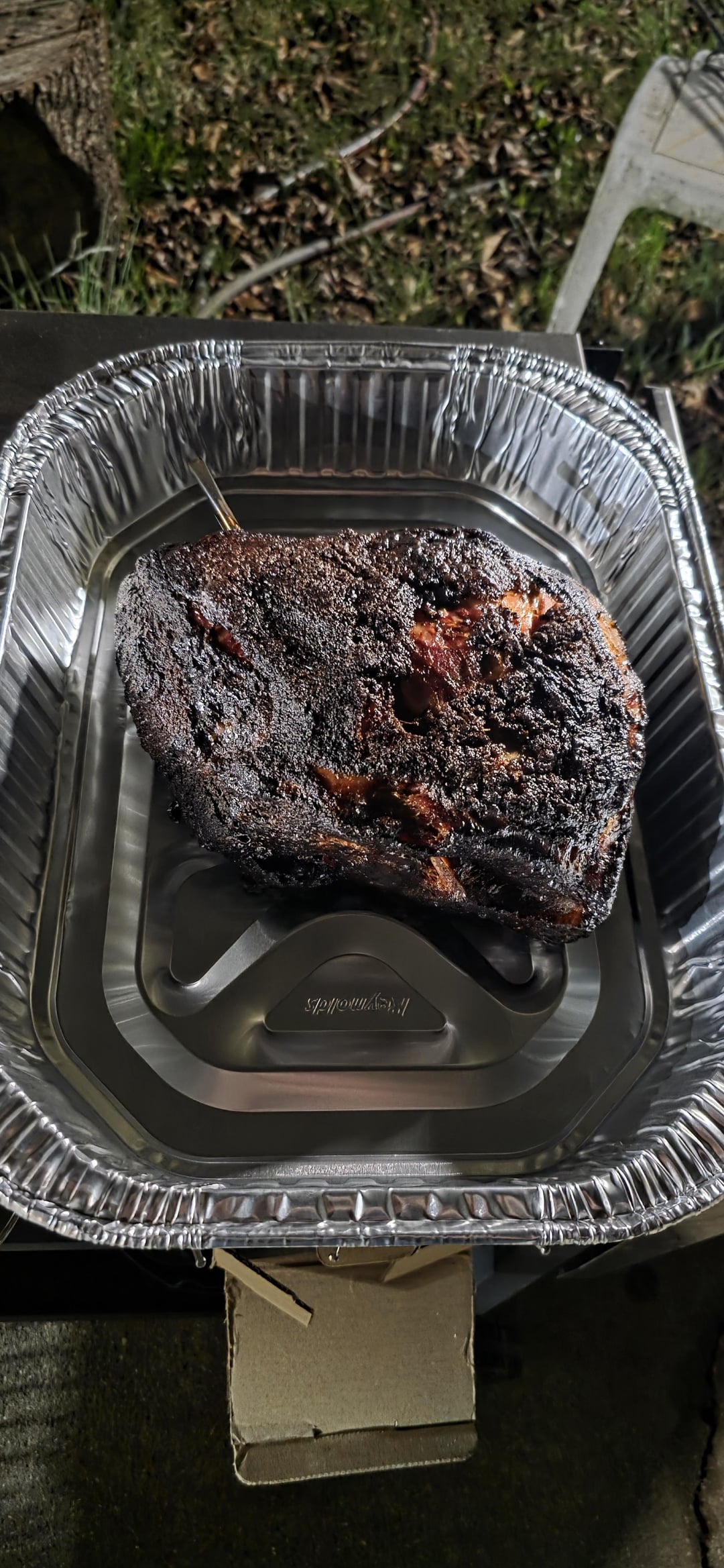 Started at 200⁰, bumped it up to 225⁰ after 2 hours. I started overthinking things at one point and dropped it back down to 200⁰ for a while, then back to 225⁰ (all this with Super Smoke on). When they hit around 165⁰ (the one on the right cooked faster: stayed about 10⁰ hotter), bumped it to 275⁰. Took about 17 hours for the one on the right, and 18 for the left one. Pics 2 and 3 are the Fajita, and 4 and 5 are Honey Hog. Pulled them at 203⁰, and both were probe tender. My first time opening the lid was when I probed and pulled the first one off.