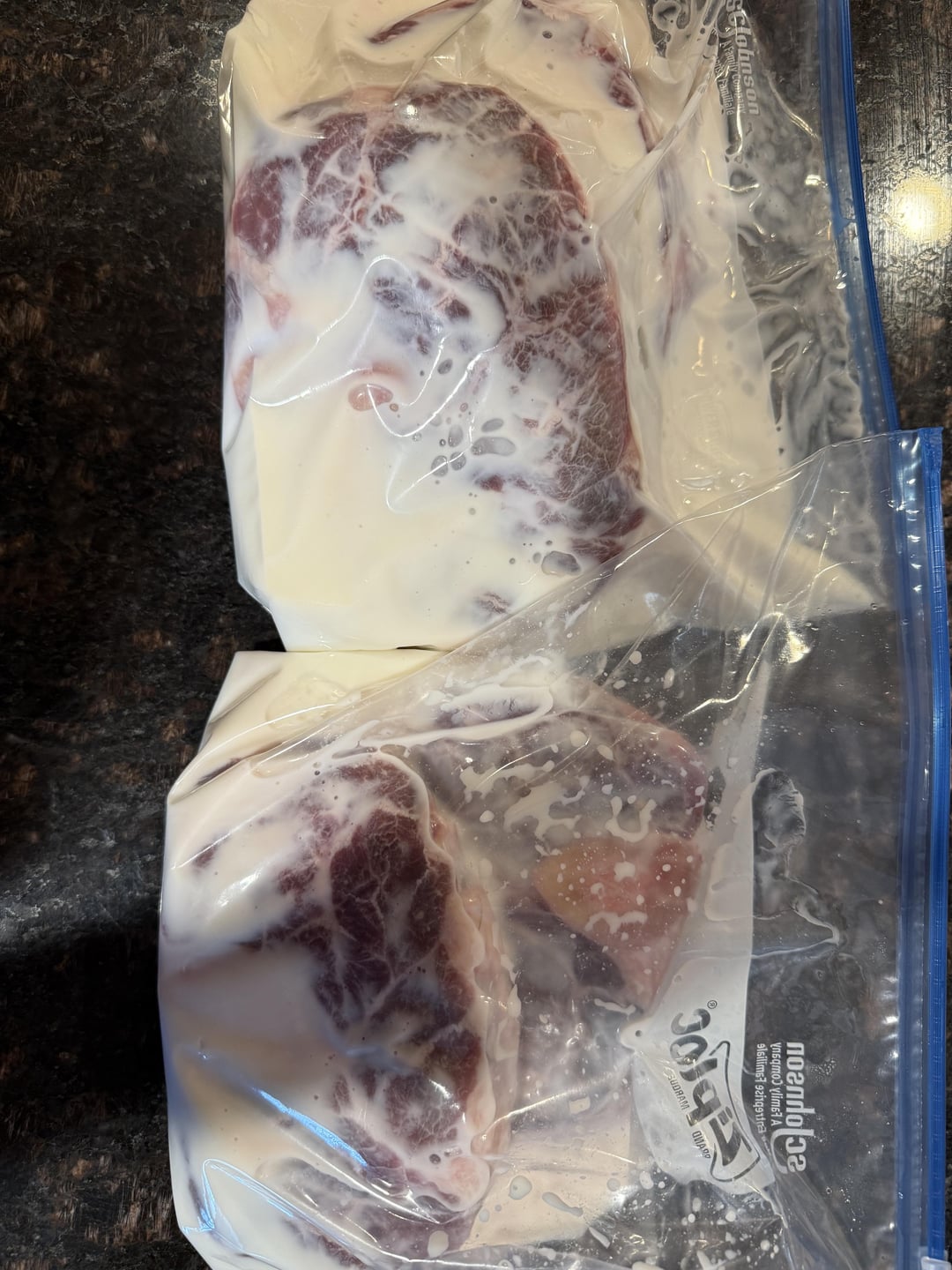 30 minutes of a baking soda bath after lightly cross hatching the shanks to help with the mineral taste. 24 hrs in a buttermilk bath to also help with the mineral taste. 24 hrs dry brine. 72 hrs in th SV at 132 f.