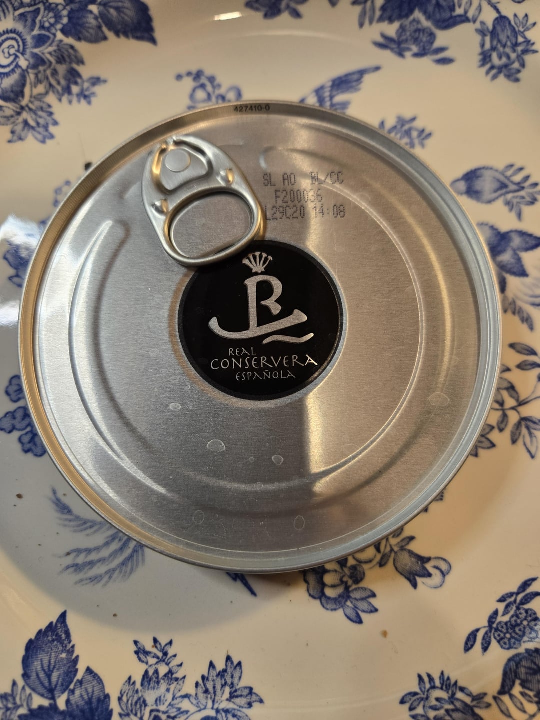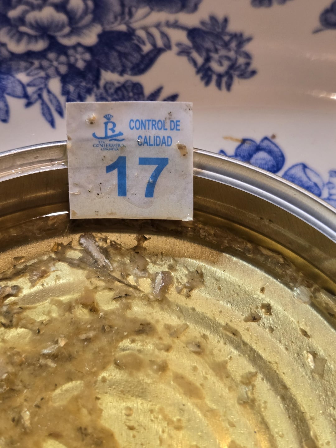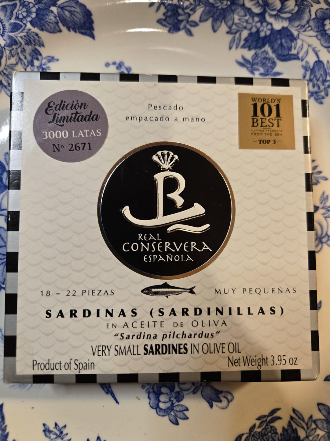 I have been saving this one for the right moment, and today was the day! This tin was ranked #3 in the world and it's not hard to see why. Tiny, dense, tender, meaty little darlings swimming in high quality Spanish olive oil, the kind that coats your lips (sopped up with a mini croissant). These are the best baby sardines I've had since the Conservas de Combados. The inspection tag under the fish was a new experience for me, anyone else ever see a tag in their tin? All in all, an experience I will remember fondly!