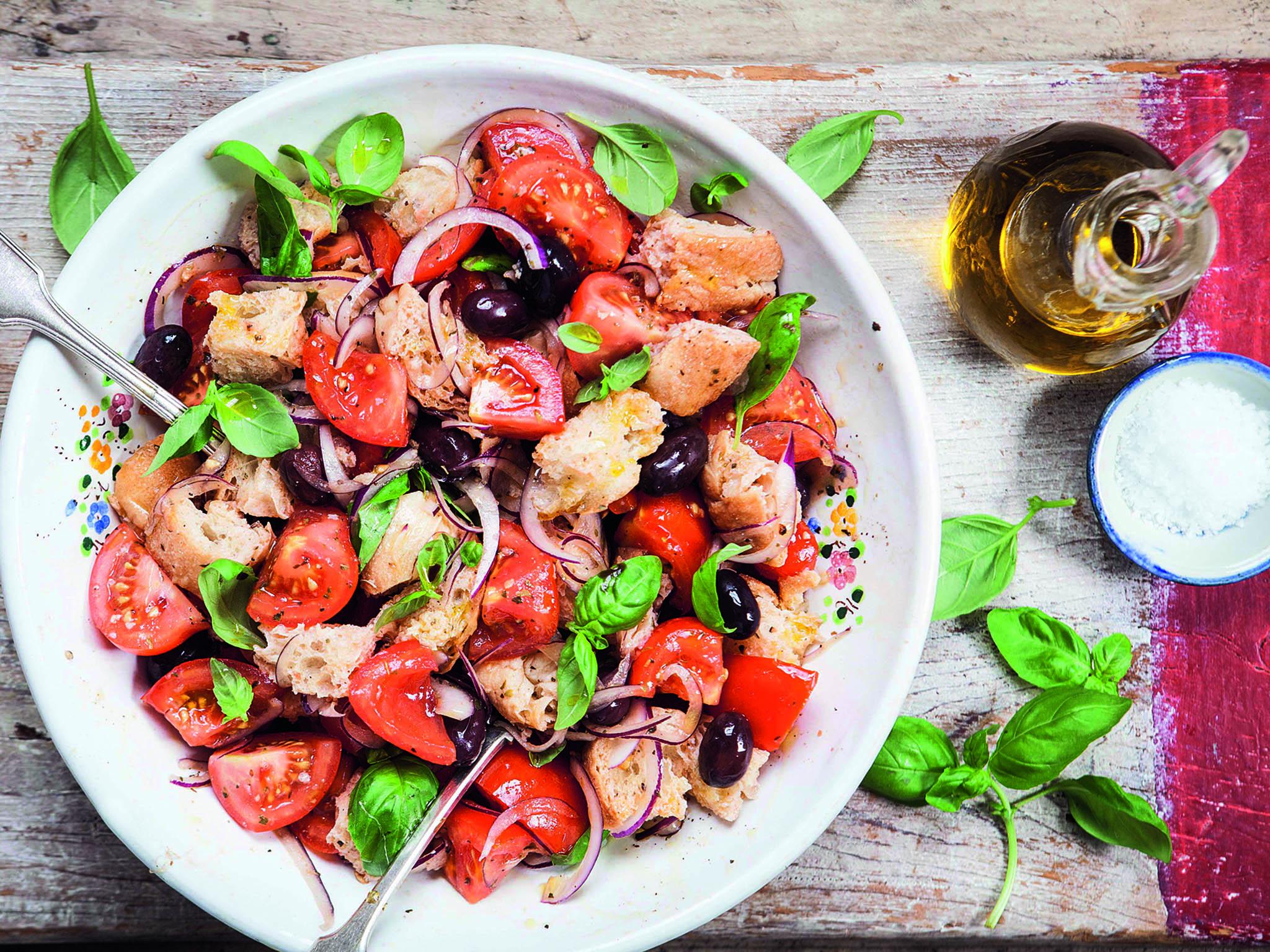 Drizzle over the olive oil, then add the bread, drained onion, olives and basil. Leave the salad to stand for half an hour at room temperature before serving.