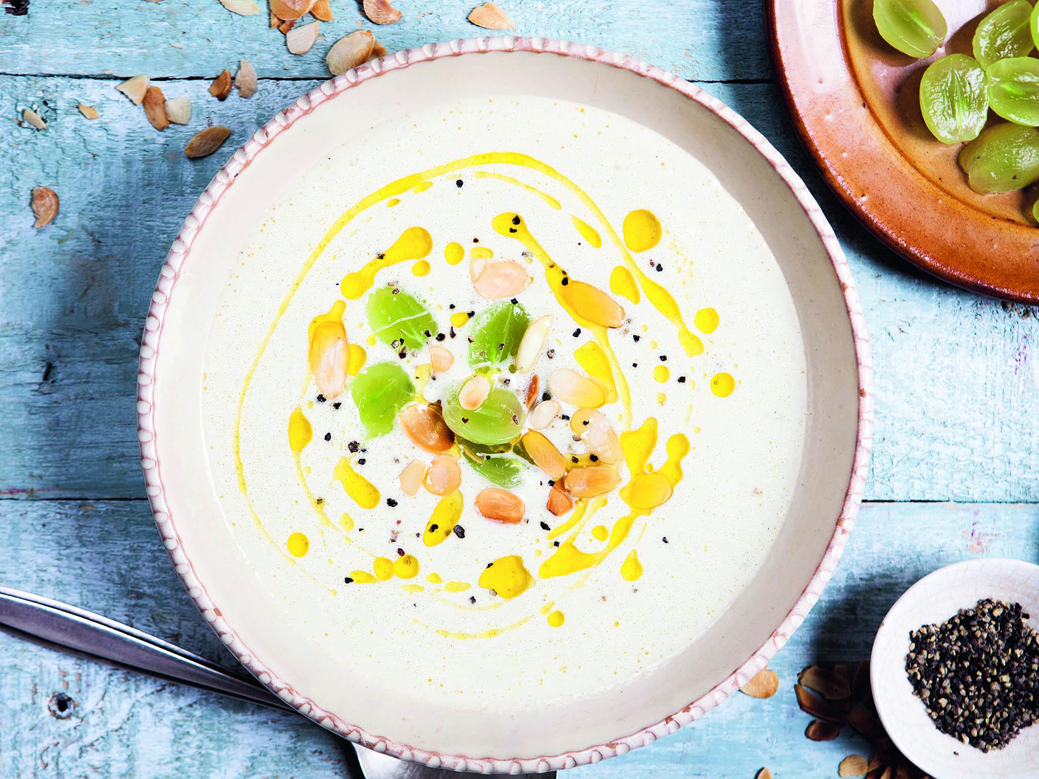 To serve, ladle the soup into bowls and top with peeled grapes, toasted flaked almonds and a drizzle of olive oil.