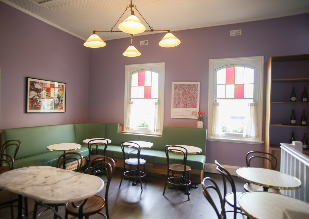The venue spans two floors, with a capacity for 50 guests. It features lilac walls, Tasmanian oak cabinetry, and green marble benchtops, all under the original stained glass windows of the historic Adelaide Fruit and Produce Exchange.