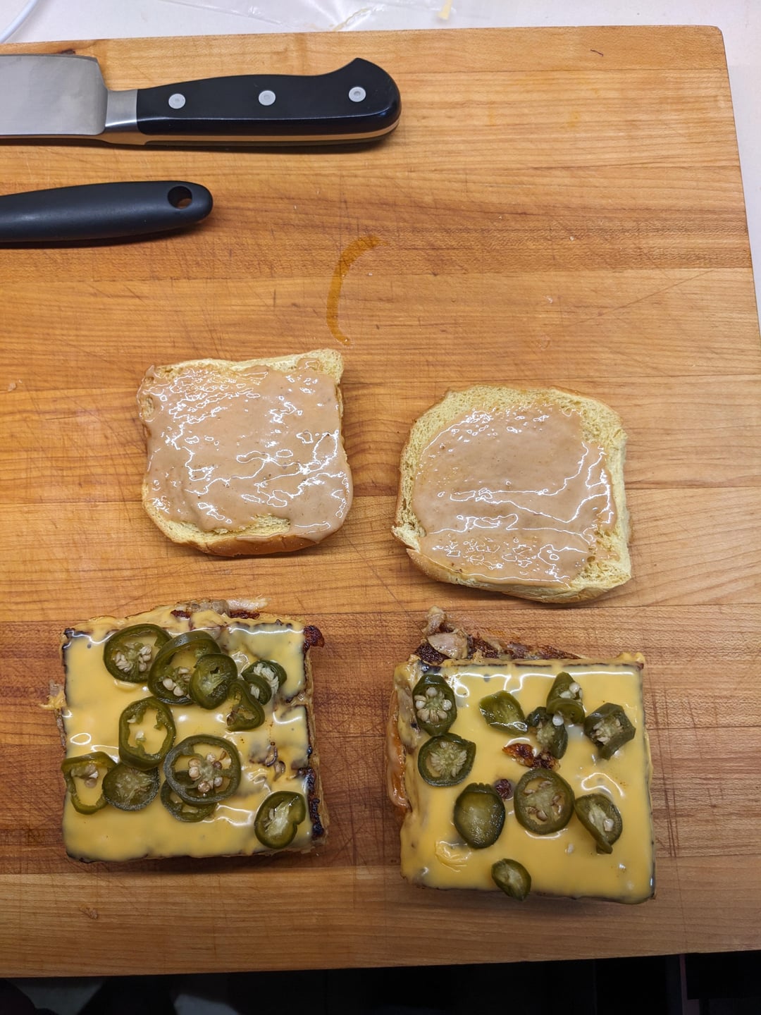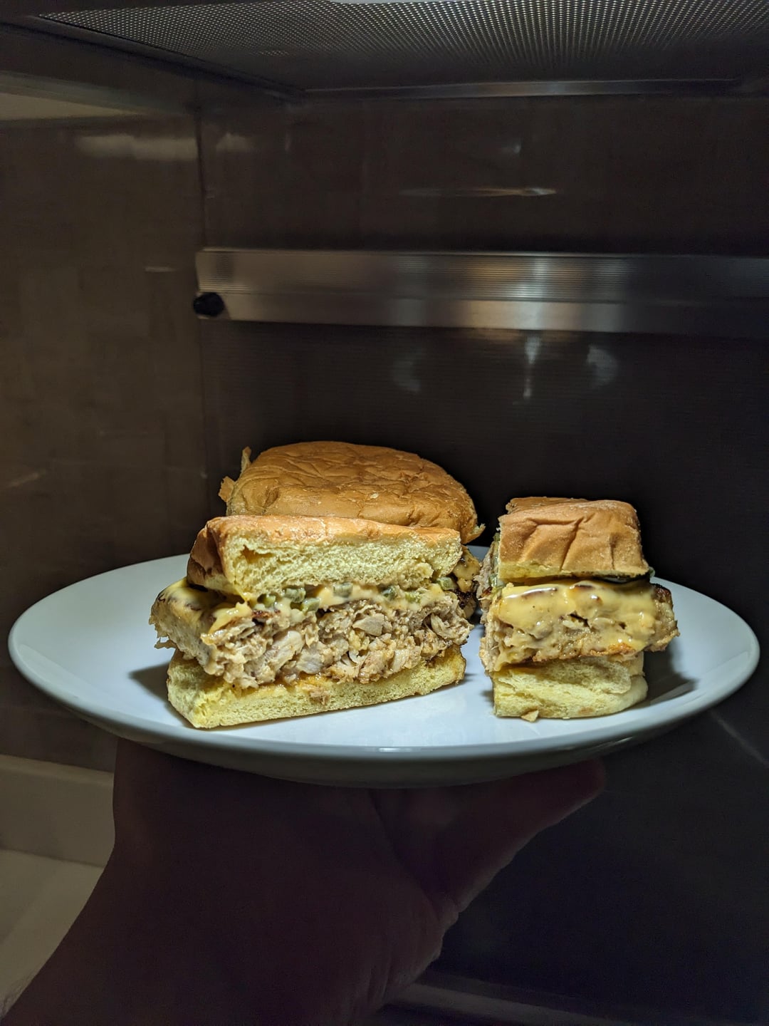 Cut the slab of chicken next day and seared with no oil in pan. Topped with cheese and jalapenos, and mayo +bbq sauce on the buns. It was pretty good.
