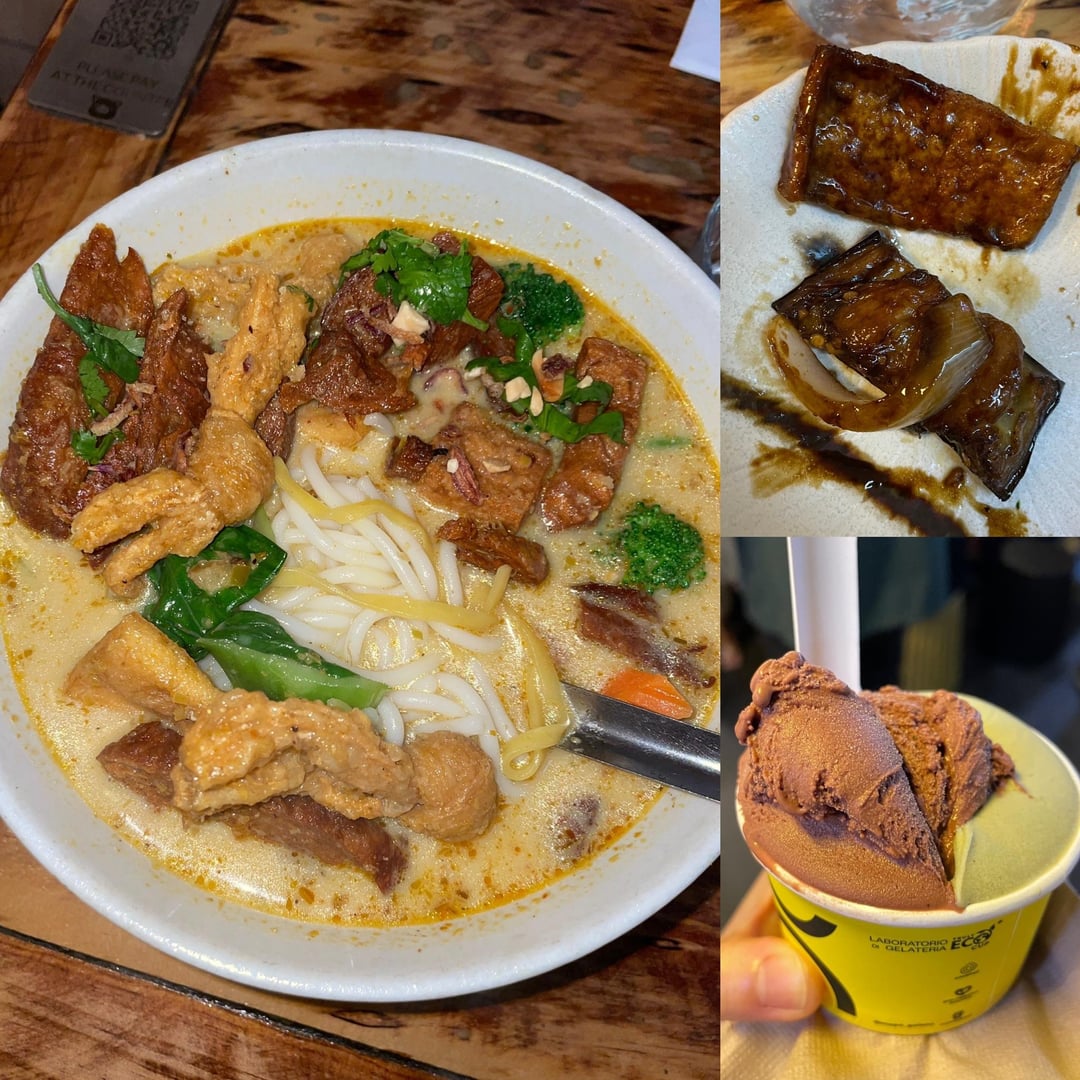 1 scoop (2 flavours) of vegan pistachio gelato & cacao dark chocolate gelatoside of 1 piece of eggplant, tofu, & onion marinated or caramelised as part of an eggplant claypot dish