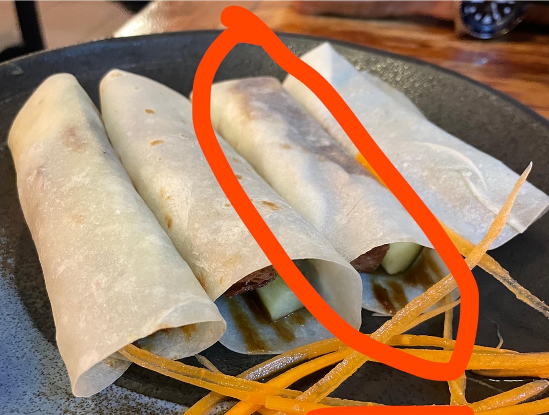 Ingredients: piece of vegan duck, slice of cucumber & Peking duck wrap and hoisin sauceGelato