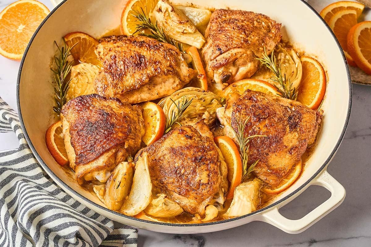 This delicious **fennel orange chicken** combines crispy-skinned chicken thighs, sweet orange, fennel, garlic, and white wine. It’s simple to make and offers rich flavors.