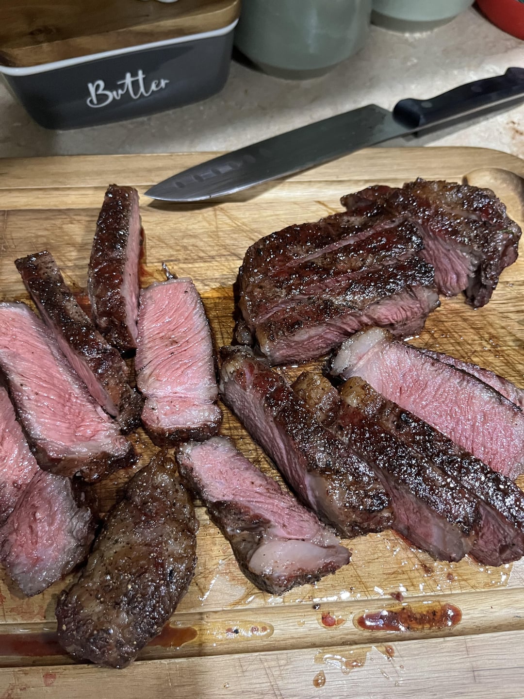 1.6” Prime New York from Rians Fatted Calf in Bowling Green Ky. This place always has top notch meat at decent prices but the marbling on these was insane. Seasoned with Livia’s SPG and let set out about 2 hours. Reverse seared in Recteq 1250 at 200 for about 1.5 hours, had a lil too much whiskey and missed my 120 by a bit too much, took one off at 131 and the other at 133. Let rest for an hour then seared in cast iron with a little homemade chili-garlic infused olive oil, added unsalted butter and rosemary after the flip then seared all 4 edges for about 15 seconds a piece. Over cooked to my liking by just a touch but it was hands down the greatest steak I have ever made, I had to call my dad after to tell him about it.