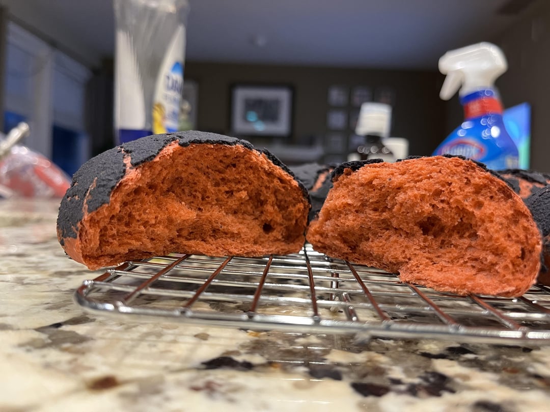 1. To make the buns: In a medium bowl, combine the milk, butter, sugar, salt, yeast, and enough food coloring to give you a nice robust red color. Gradually add the flour until you have a nice soft dough that isn’t too sticky. Turn out onto a lightly floured surface and knead for a couple of minutes, until it bounces back when poked. Place in a clean bowl and cover with plastic. Set in s warm place to rise for about 1 hour, or until doubled in size.rooo coloring to give you a nice robust red color. Gradually add the flour until you have a nice soft dough that isn’t too sticky. Turn out onto a lightly floured surface and knead for a couble of minutes, until it bounces back when poked. Place in a clean bowl and cover with plastic. Set in a warm place to rise for about 1 hour, or until doubled in size.