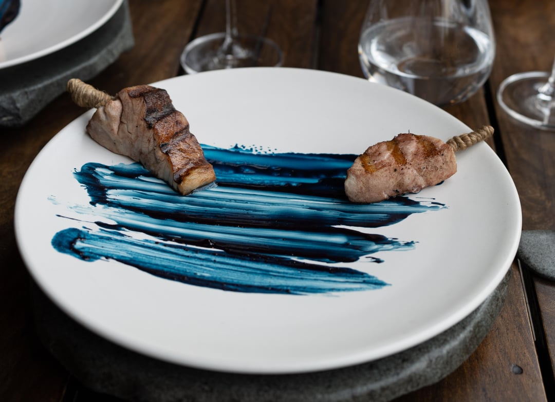 ”Easter Island Seas” Chilean Seabass and Tuna 1/10, barely edible, very fishy, plating very nice and the blue sauce was good, but not enough to make the fish edible