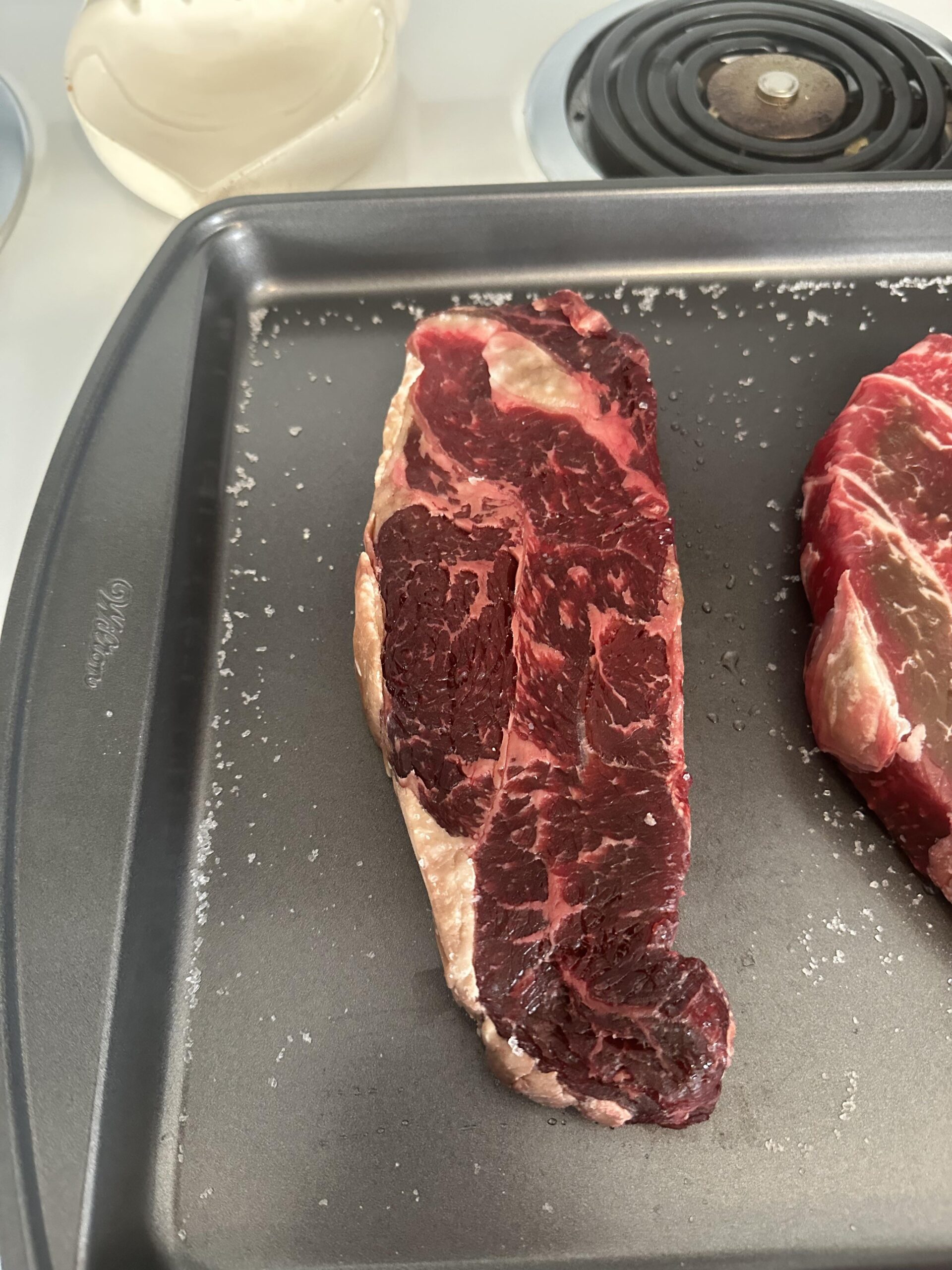 Bought this 12 oz New York strip steak on Saturday, brought it home and salted it and put it in the fridge. My other 2 steaks (8 oz New York strips) look less aged but have been sitting out just the same. Will this need trimmed for dinner tonight?