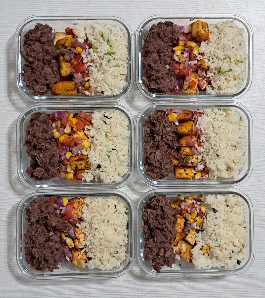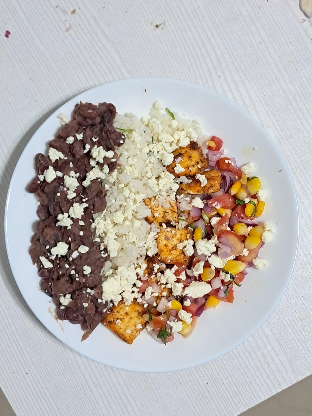 Used 100gms of cottage cheese air fried in spices (chilli powder, salt, oil, cumin powder, pepper powder), 100gms of cooked rice fried in butter, salt, lemon and coriander, 100gms of cooked kidney beans (fried with caramelized onion, green chilli) and some vegetables (onion, tomatoes, sweet corn) mixed with lemon, salt and coriander.