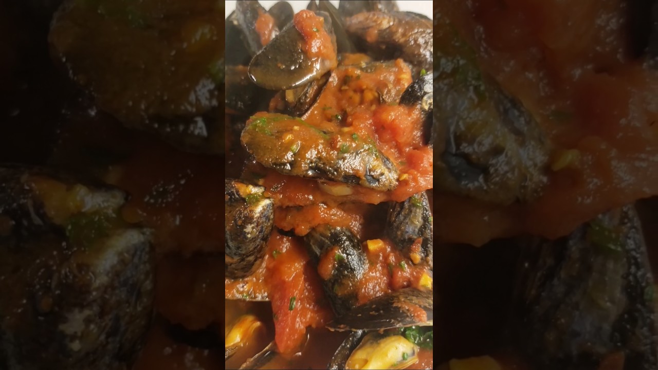 Well, enough of all that. Get an oven preheating to 500⁰. In a roasting pan, warm up a TBSP of olive oil and add a few cloves of garlic, a tsp of red pepper flakes and a 1 tbsp of tomato paste. Once that has cooked for a few minutes, add a cup of white wine. Cook for a minute, reduce a bit. Then add a 28oz can of crushed tomatoes. Cook that for 5 mins. Add a 2-4 pounds of mussels, mix. Cover the pan with foil and put in the oven to roast the mussels for 15-18 mins. Any mussels that don’t open, discard. Now add a few tbsp of minced parsley. You’re done. Serve with crusty bread and a nice red wine. You’ve got yourself a great meal. That whole meal cost me about $11. … Eat.Drink.Savor.