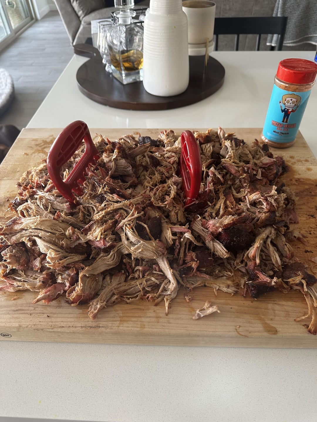 Wrapped in foil boat, added an apple cider/apple juice mixture and poured it over the top, then bumped it up to 250 to finish, pulled at 200 degrees and then let sit for 45 minutes before shredding.