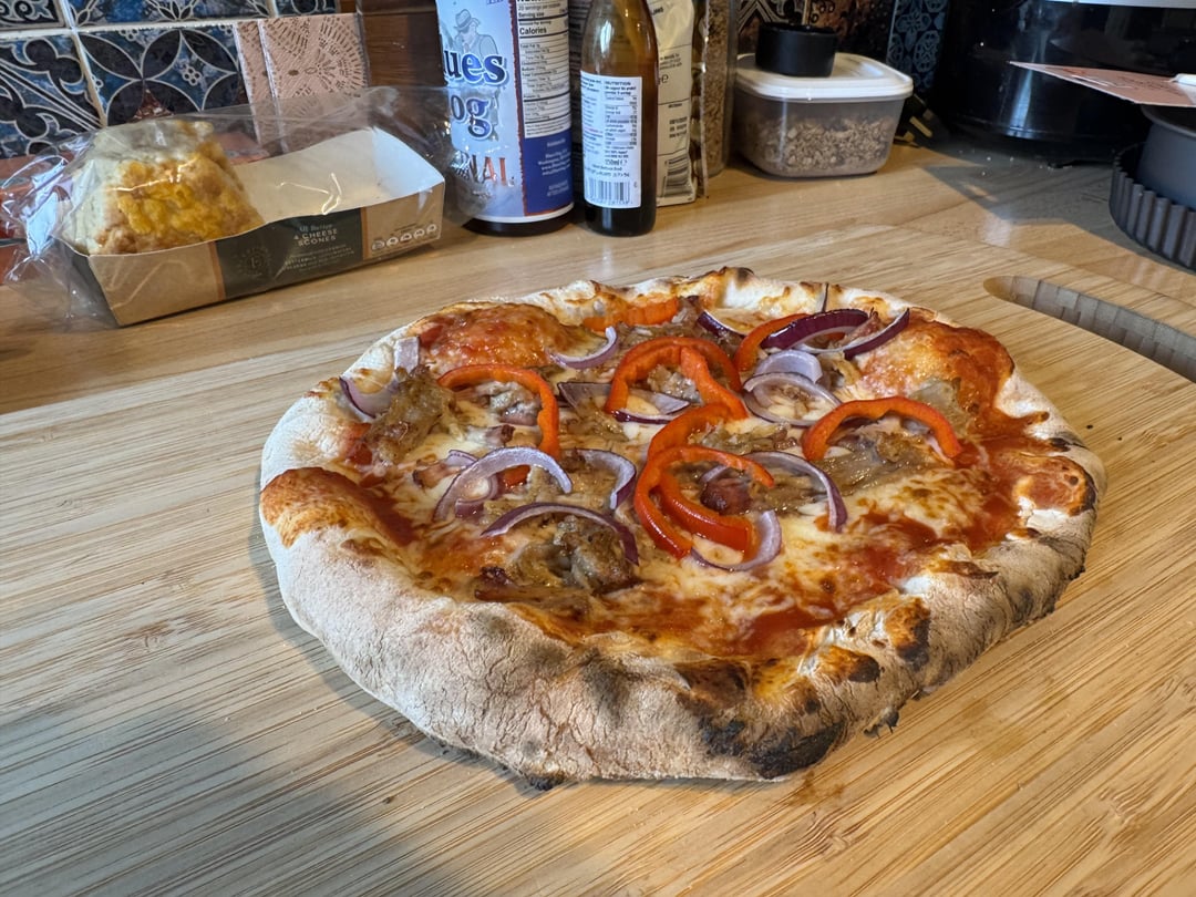 Looks great for a first time. Making your own dough will definitely elevate the look and taste. It’s really satisfying cold proofing over 48-72 hours and balling your dough the day you make the pizza or balling first and proofing balled. Either way it’s rewarding knowing you made the dough. A 24hr room temperature is a good place to start!