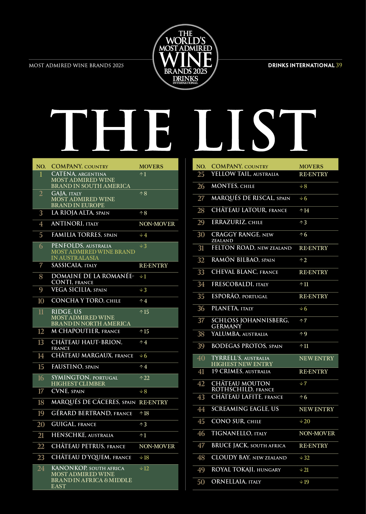 The 2025 list featured two new brands, Screaming Eagle from the US and Australia’s Tyrrell’s which took the award for Highest New Entry. The Highest Climber award went to the seventh-placed Sassicaia after the Italian brand had fallen off the list in 2024.