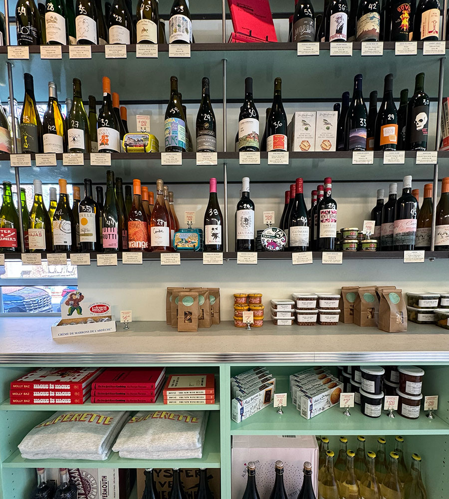 When you walk in, the layout is partially similar to that of Primal Supply. But where there were once cases displaying cuts of marbled meat, there are all the accoutrements for your dream pantry or charcuterie board: cheese, coils of sausage, Castelvetrano olives, cassis jam, French chips, and candies — and, of course, a robust wine collection, the real star of the show. There’s also a long bar, tables with booths, and window seating for those who want to stay a while.