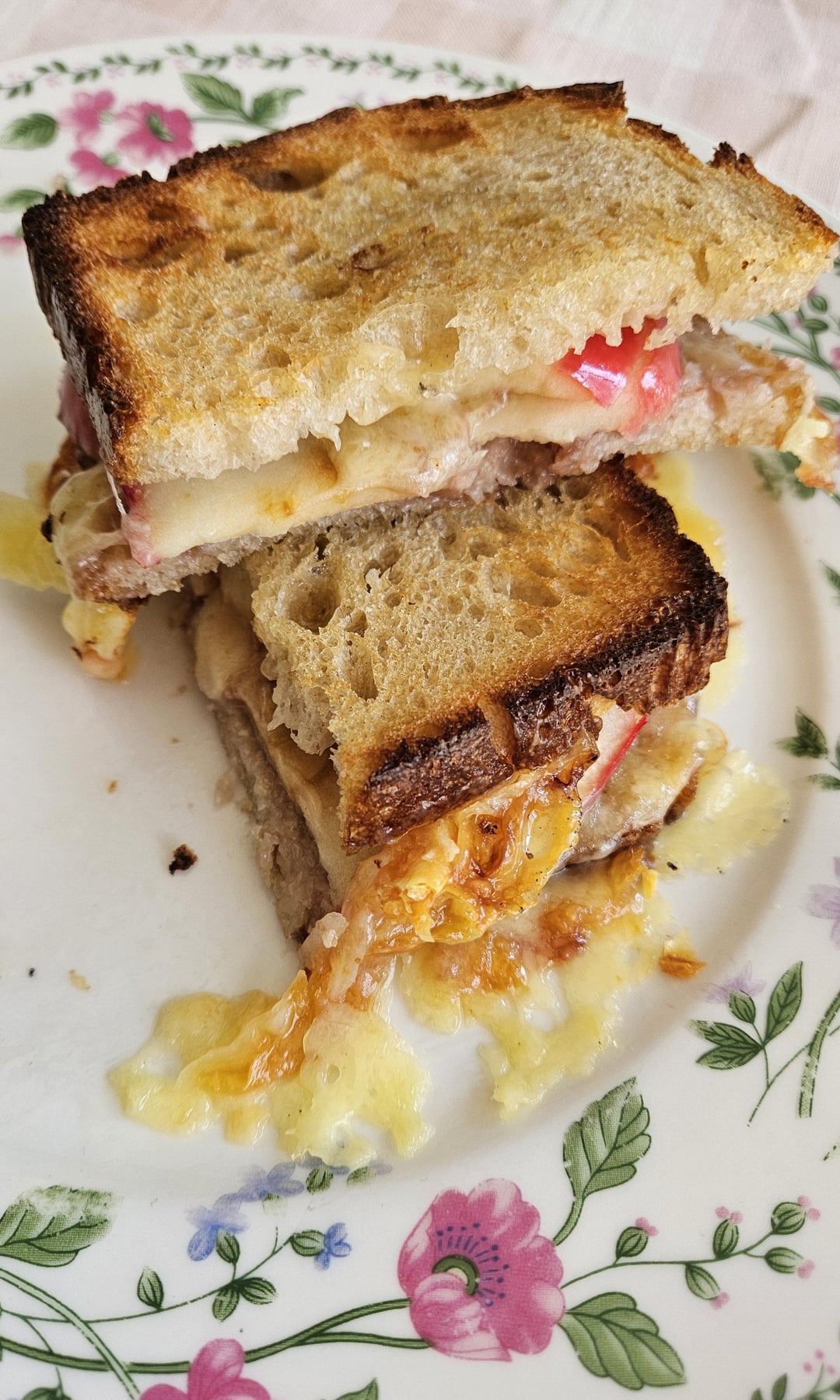 Sourdough, light spread of strawberry jam on one slice, sharp cheddar, camembert, pink lady apple. Cooked in the toaster oven with a pat of butter on top, for funzies ig. Cooked on a silicone mat so none of the crispy cheesy overflow was lost.
