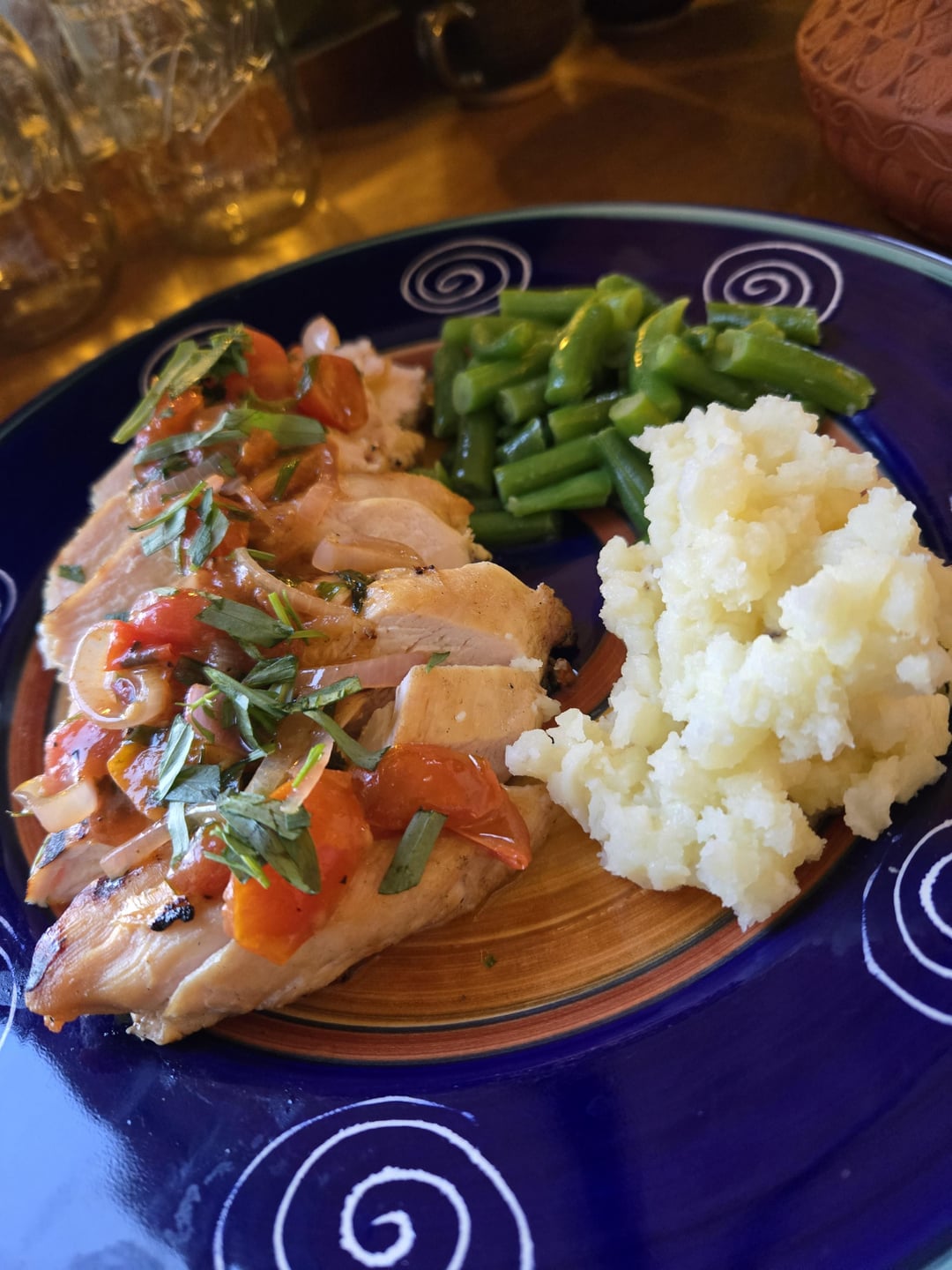 A little cold (around 40ish F) but felt like grilling. Brined two chicken breasts for an hour and then onto a very hot hardwood fire. Served with a yummy red onion, cherry tomato, tarragon and lemon sauce. Mashed potatoes and green beans.