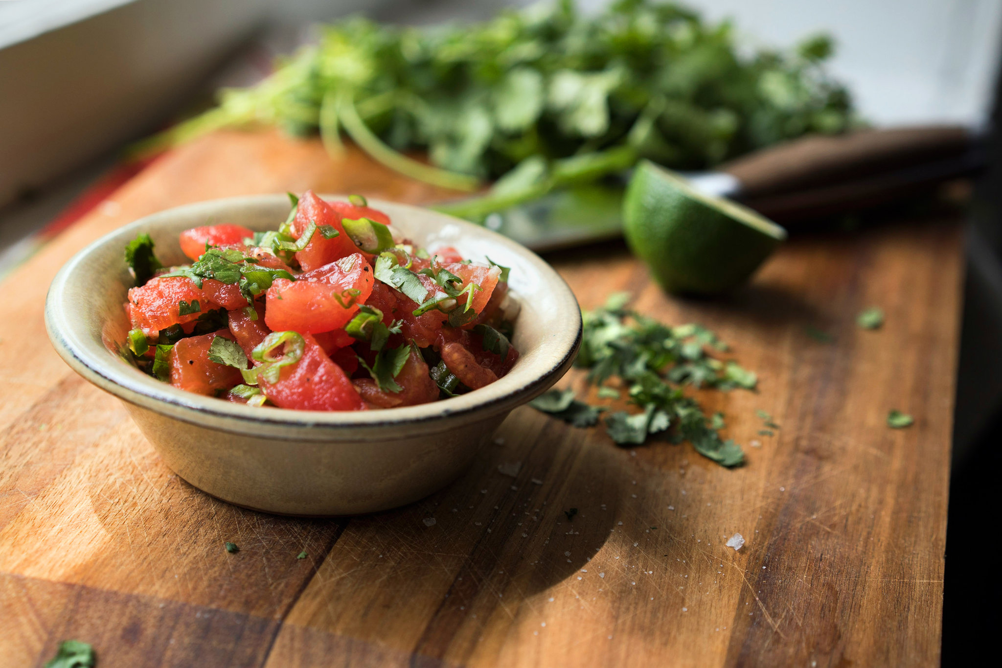 The strong flavors of scallions, cilantro and jalapeño complement the sweet juiciness of summer tomatoes in this traditional salsa. It makes the perfect accompaniment to grilled steak or tortilla chips.