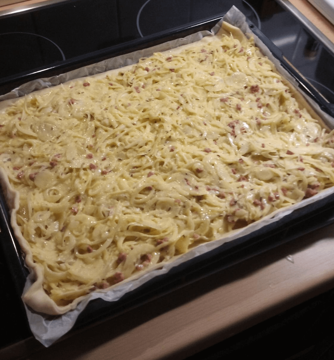 My initial reddit post.. and it declares that in this house we love onions! Ruegenwalder vegan smoked ham, 10 onions, story bought pizza dough, and biovegan like ruehrei or omelette mass ..