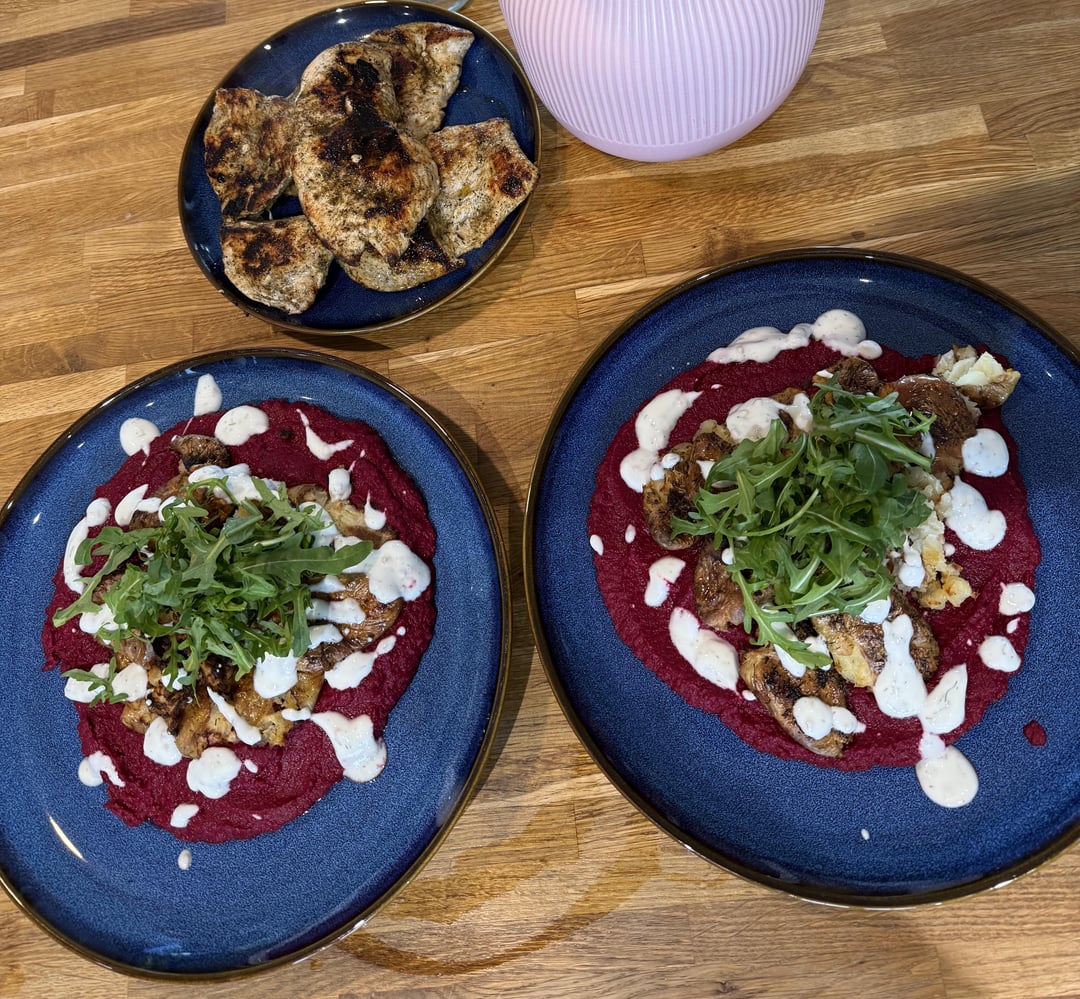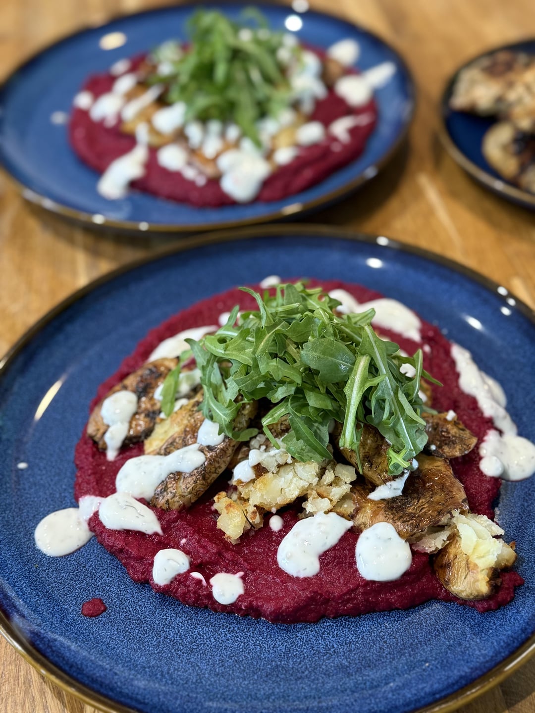 Roasted beetroot and cannellini bean puree (think it needs tweaking. I didn't have tahini like it wanted). Crushed garlic and dill potatoes and a Greek yogurt dressing. Gyros spiced chicken on the side.