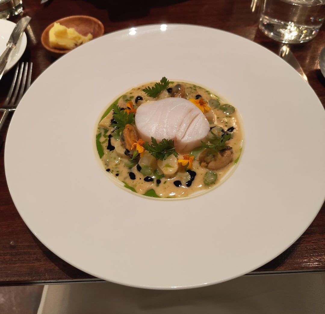 Cod with barbequed mussels and white asparagus. A rather typical cod dish but well executed nonetheless.