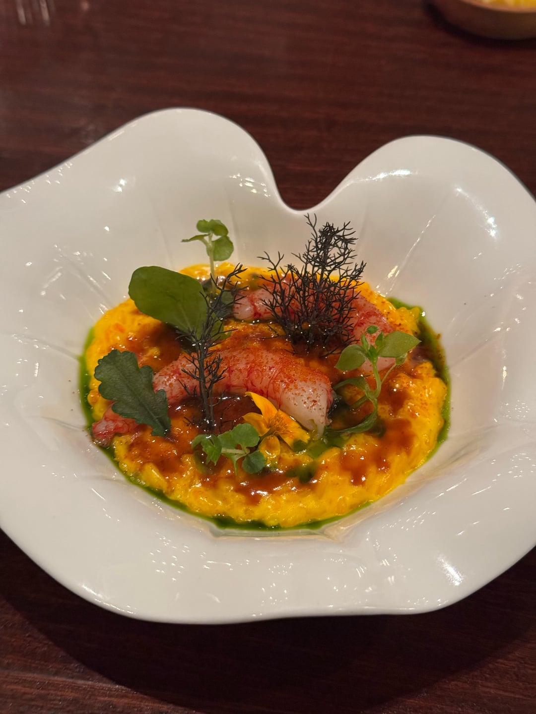 Course 2: Red Sicilian prawn with Acquerello risotto, shiso leaves and prawn bisque.