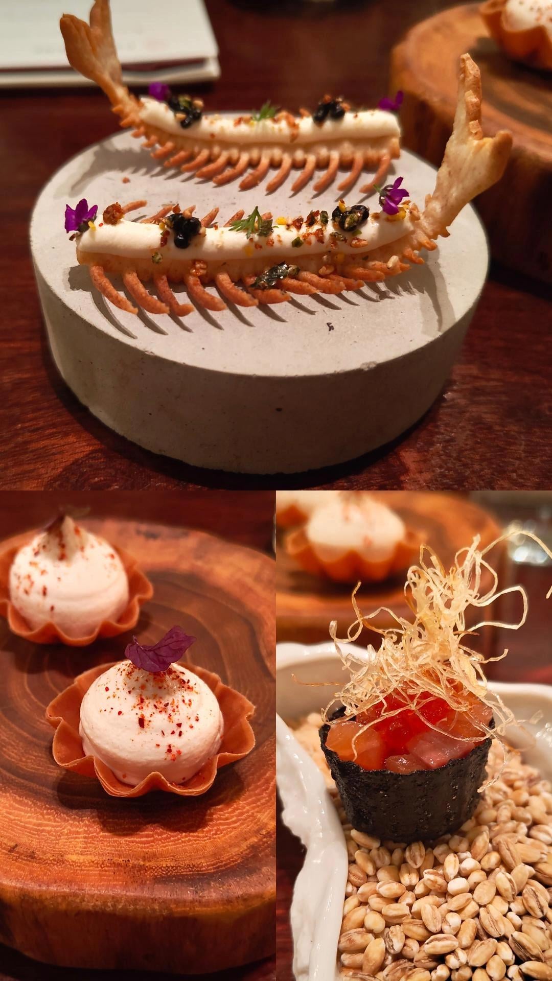 Canapes: Taramasalata with paprika, Trout with crispy leek and wasabi condiment in an ash tartlet, Herring bone tuile with smoked eel puree.
