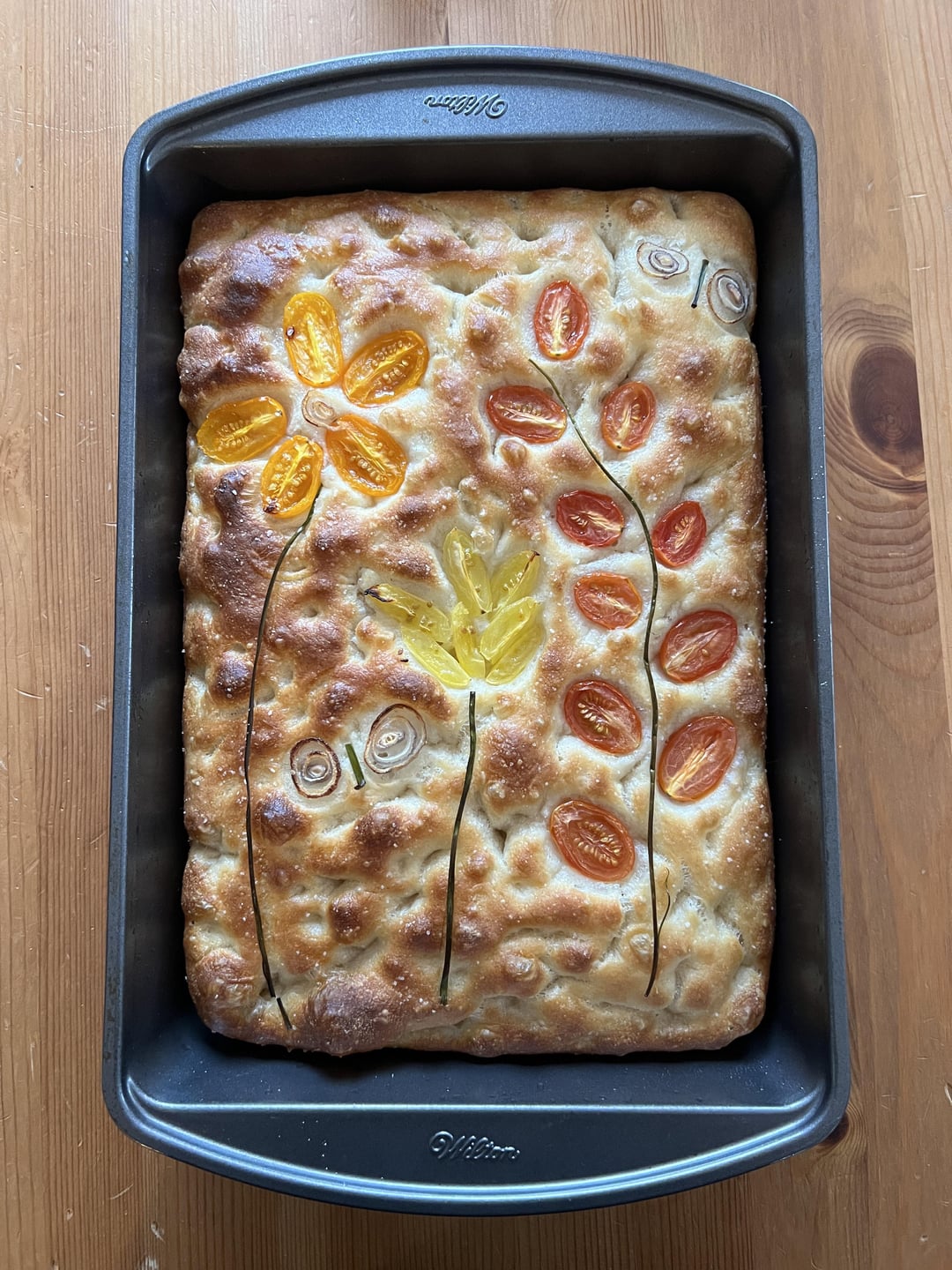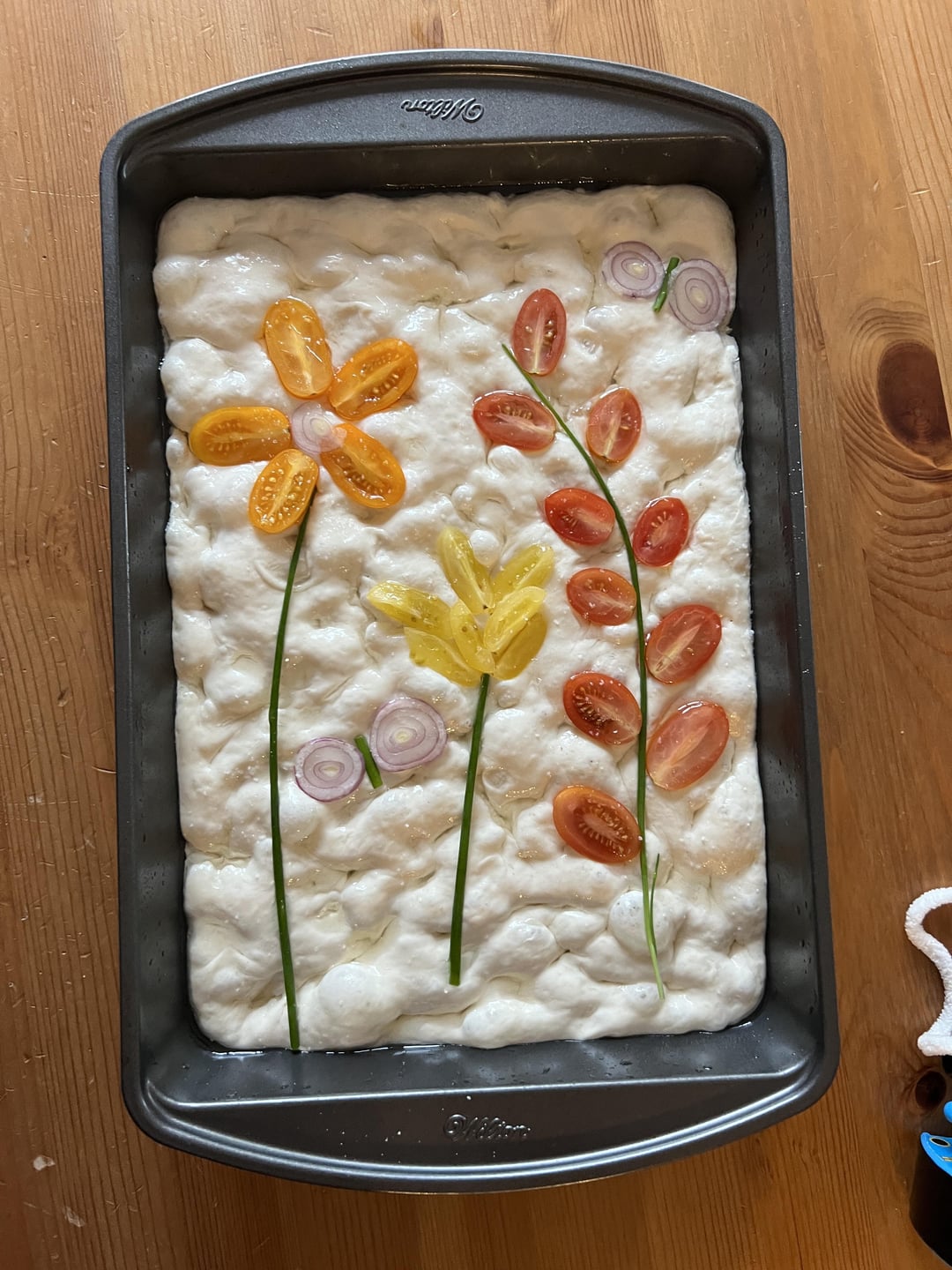 My kiddo saw me looking at photos of garden scape focaccia and asked if we could make some. A fun project to do together!