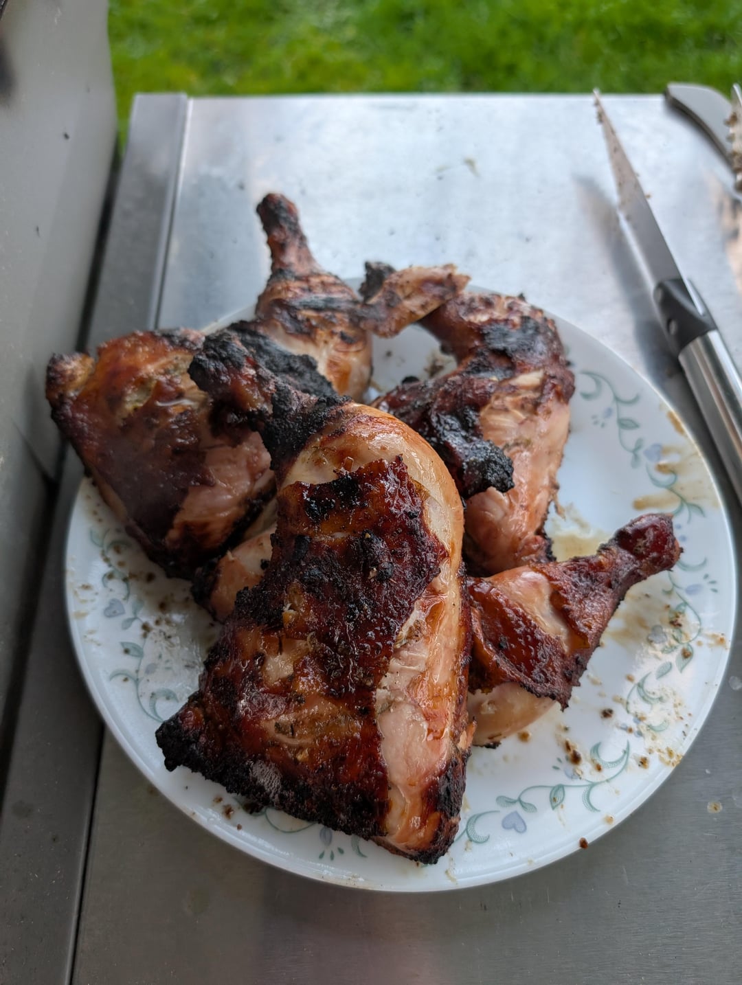 Followed the Jerk Chicken Legs recipe in the Traeger app, subbing 4 Serrano peppers since no one near me had Scotch Bonnets or Habaneros. Ended up marinating for 24+ hours due to some last minute plan changes. Smoked on my Century 885 at 165 for 45 min with a smoke tube going as well. Up to 350 for another 45 with a quick finish on the gas grill to really crisp up the skin.