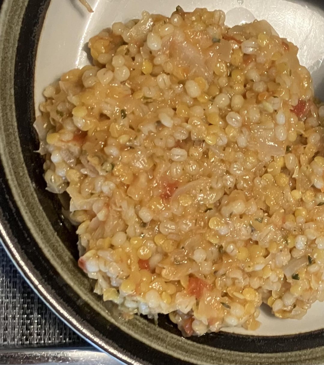 In an effort to follow the portfolio diet to reduce my husbands cholesterol, we eat barley several times a week. To reduce cooking time, I usually prepare 6 servings (so 3 meals for the both of us) at once and only cook the protein on the day of eating. While flavours (vegetables and spices) vary, the cooking method is basically the same every time. I mostly wing it, but the following ingredients are always in it: rolled barley, vegetable stock, some kind of vegetable, onion, spices and psyllium husk.