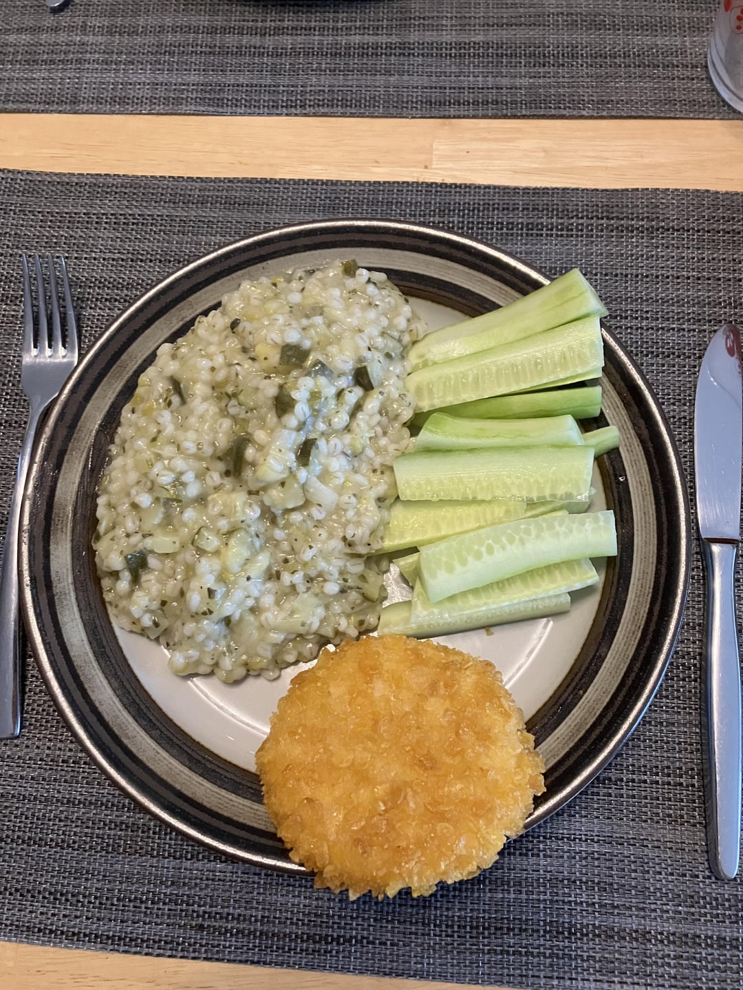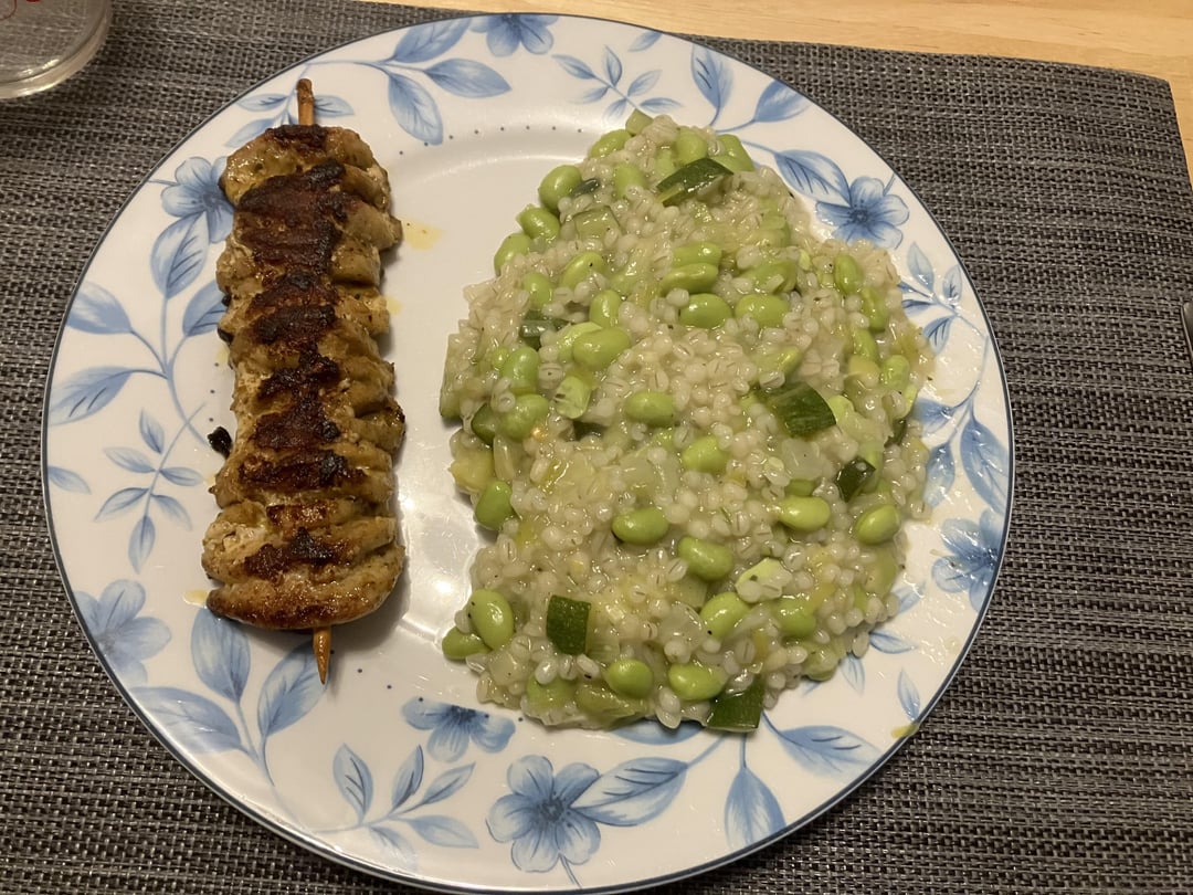 Third one is leek, zucchini and soybeans (edamame), served with a chicken skewer for me and (not pictured) a white bean burger for my husband.