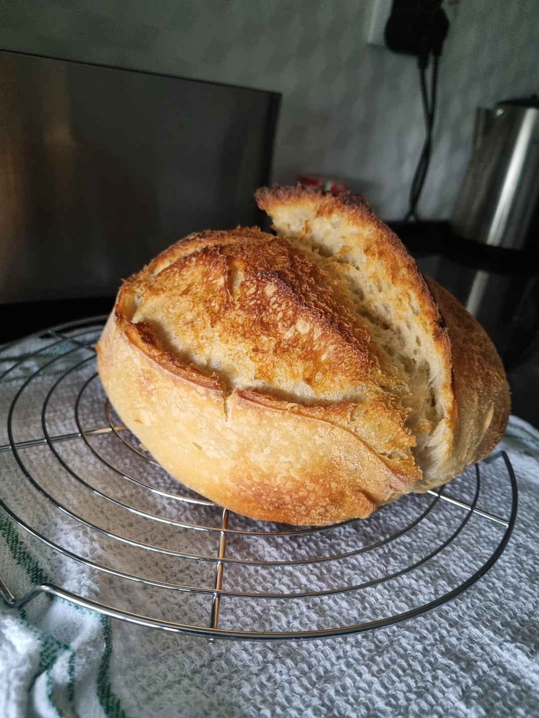 Mixed dough without the salt and let fermentalyze for an hour. With the 1st stretch and fold added the salt, but did not stop stretching and folding until the dough didn't want that anymore. Did 3 more normal rounds of stretch and folds, 30 minutes apart. Let finish bulk rising for a total of 6-6:30 hours at 23°C dough temp (less time BF was needed as I added more starter). Preshaped, let it rest for 15-20 mins on the counter. Did a caddy clasp for the final shaping and cold fermented for at least 14 hours, but probably closer to 18. Baked in preheated dutch oven at 230°C for 30 minutes covered and 15 uncovered. For this loaf I also made the score shallower.