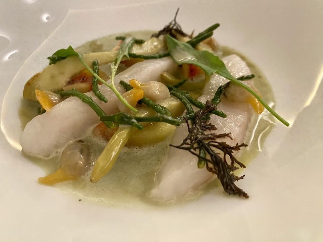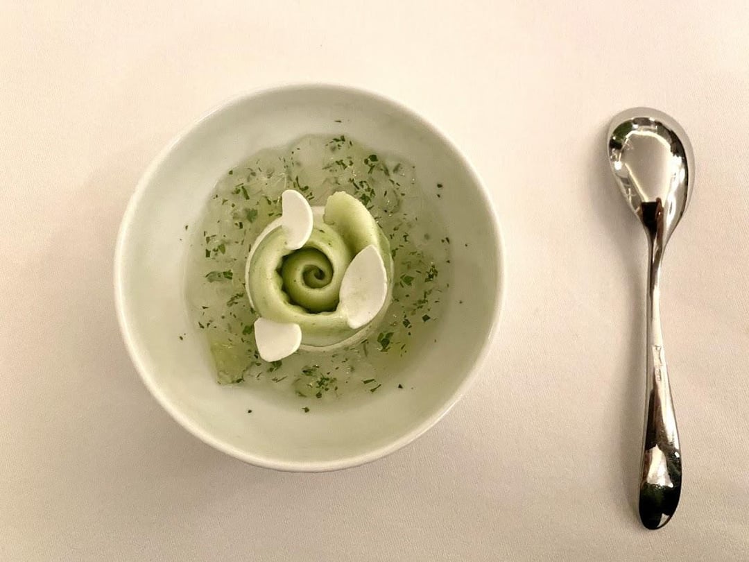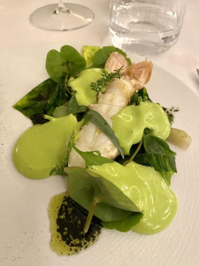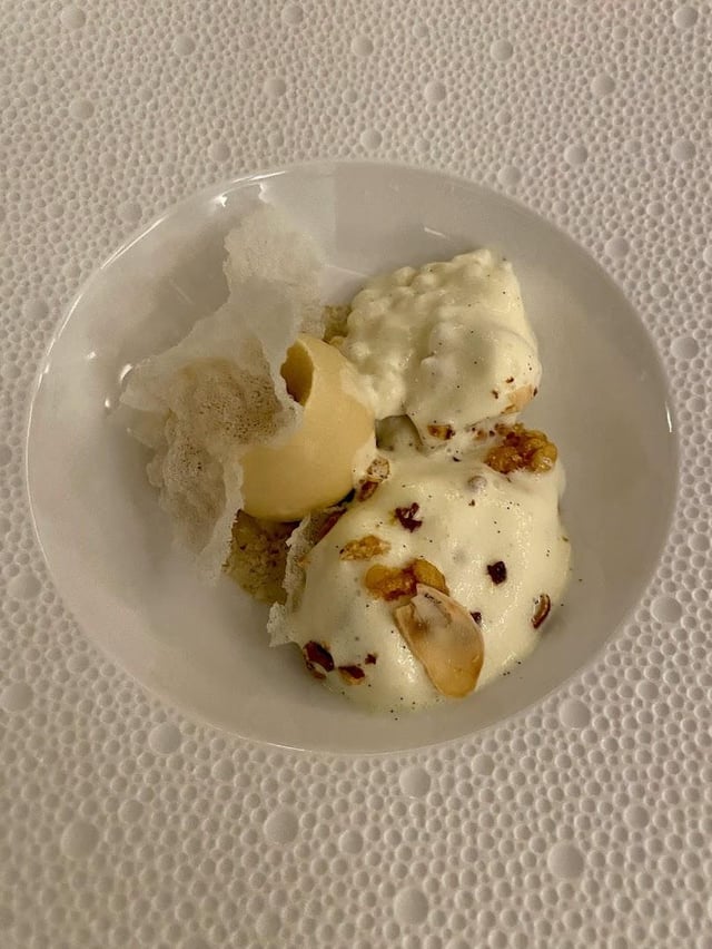 Starting bites: I didn't upload all the pictures, but there was quite a few. There was a clam with champagne granita, potato chip with thyme, langoustine with mayonaise, onion tart with shrimp tartare, and kohlrabi with ginger (pictured). We were also given a tiny croissant stuffed with black olive filling. Overall fairly standard and a decent way to start the meal. Bread was freshly baked and very good.
