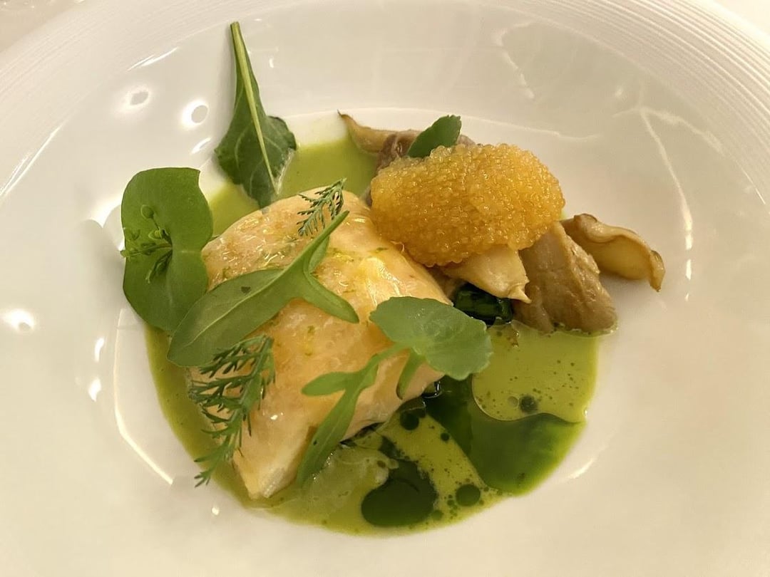 Next was a langoustine with lettuce cream. I thought the langoustine was well-prepared and the veggies were fine. If I had to be picky, there was a bit too much sauce, but the unripe strawberries hidden in the leaves added an interesting touch. We had a dish of gently cooked trout next. Good flavors and textures especially with the addition of roe on top.