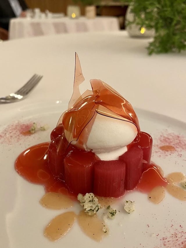 Desserts were next and this is where I fell absolutely in love. Desserts are by Yu Tanaka (previously from Epicure). There was a delicuous aloe sorbet with mint and mergine. I could have eaten about 5 of these as I had now forgotten how full I was. We then had a rhubarb with red shisho dessert with yogurt. Good textures and flavors and overall light and refreshing.