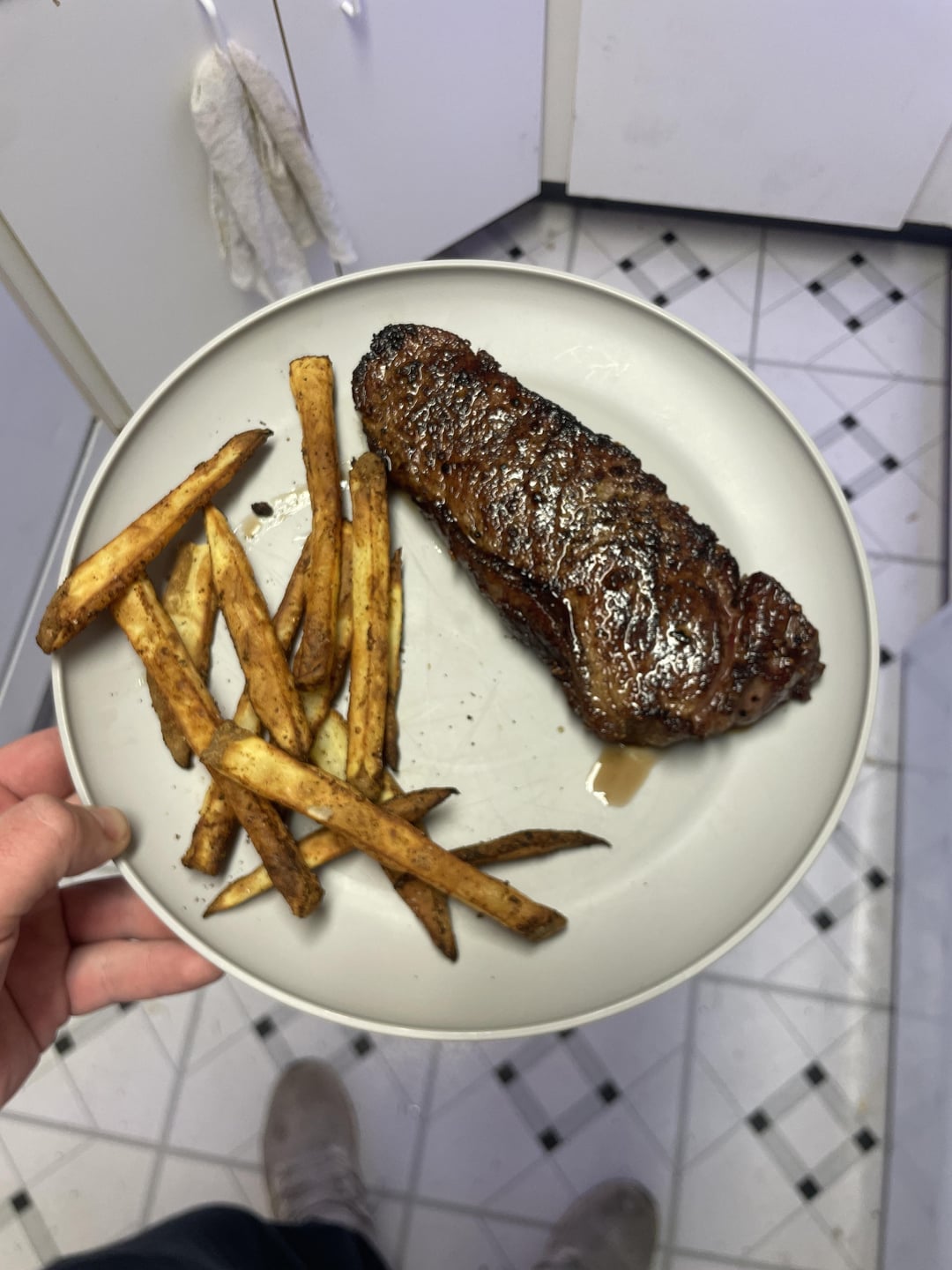 By the time bro bought the steak, he only had enough money left for 1/3 of a potato.