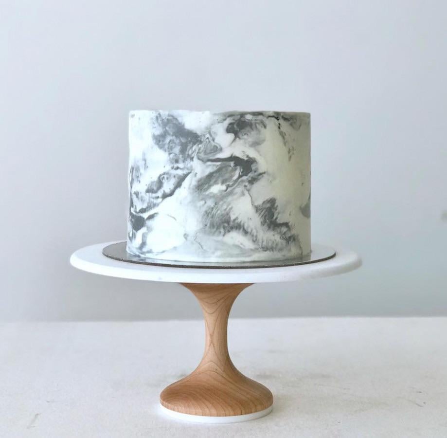 If you do want to give it a go and experiment by using the acetate/parchment paper method— using a crusting cream cheese frosting recipe or adding extra powdered sugar until stiff, then doing the marbling technique onto the sheet. You’ll wrap it around the circumference of the cake. Chill the cake with the sheet untouched until firm and then once its all chilled unwrap the sheet and do a light smoothing. It may not come out exactly like your reference photo but a step in that direction.